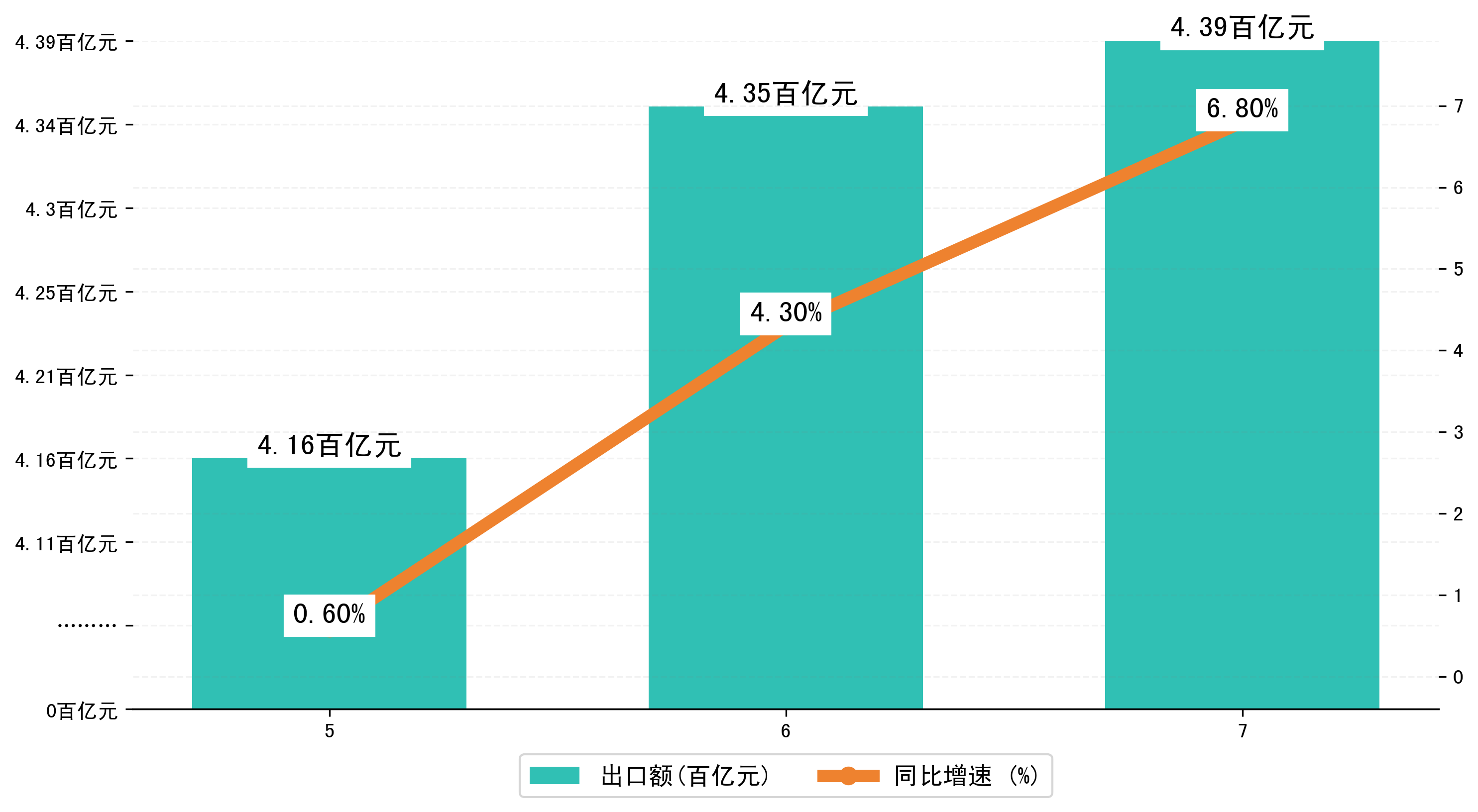 以人民币计,2024年7月厦门市出口额为438,7671.6951万元,相比上月增加了3,5886.5392万元;相比上年同期增加了81,0619.0819万元,同比增加了6.80%。