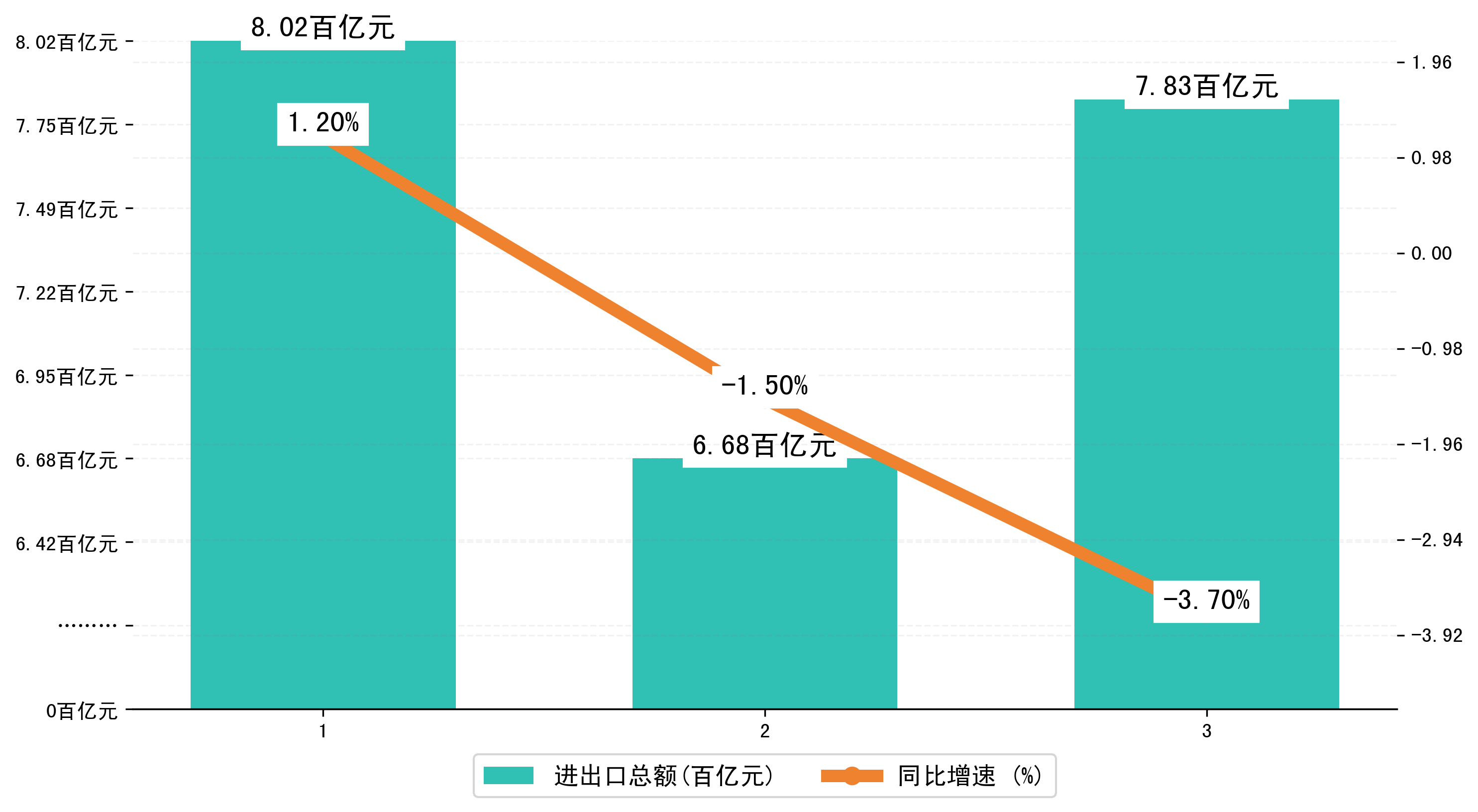 以人民币计,2024年3月厦门市进出口总额为783,4485.3655万元,相比上月增加了115,0104.2044万元;相比上年同期减少了68,9929.423万元,同比减少了-3.70%。