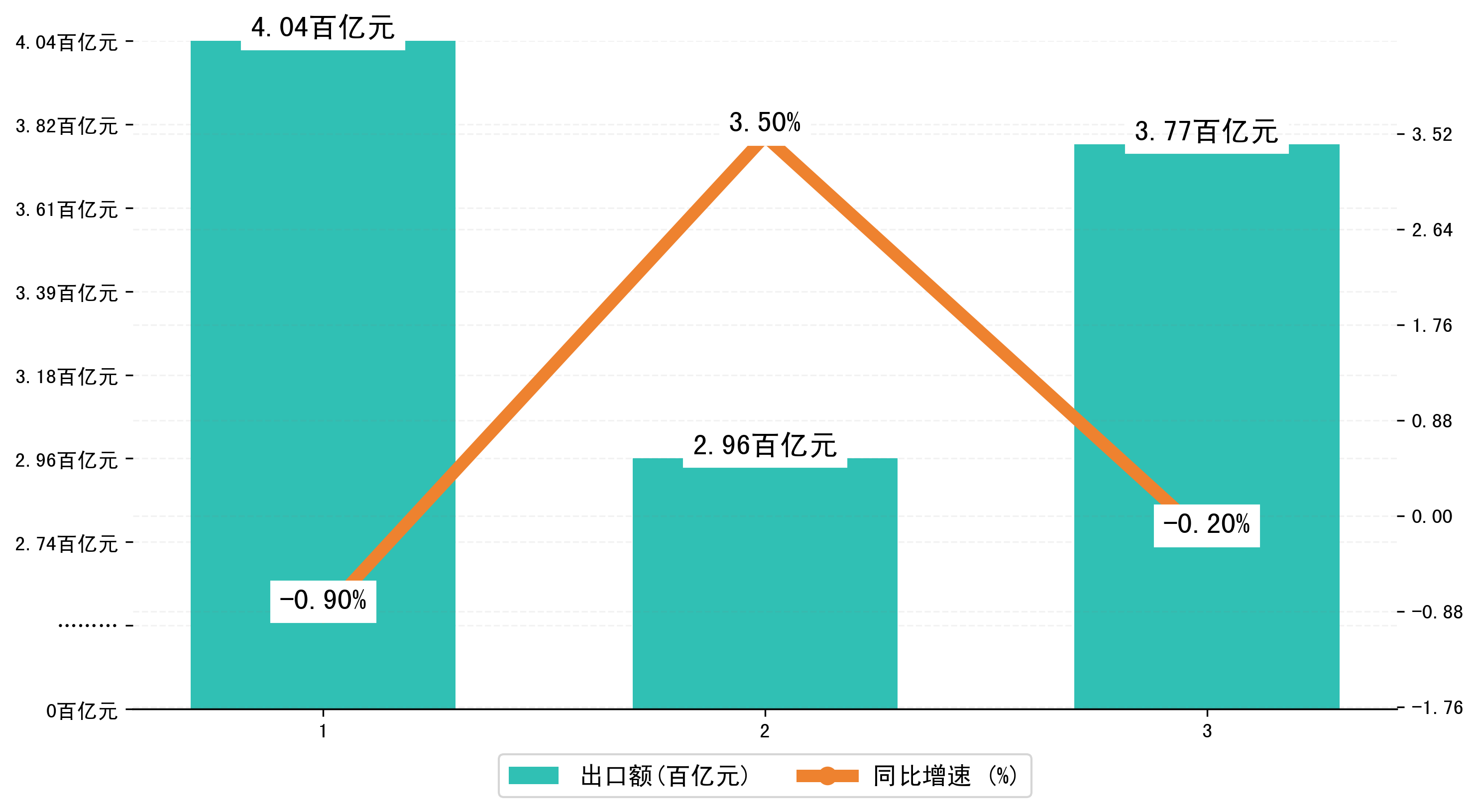 以美元计,2024年1-3月厦门市出口额为151,6158.2587万美元,相比上年同期减少了5,3497.1086万美元,同比减少-3.40%。