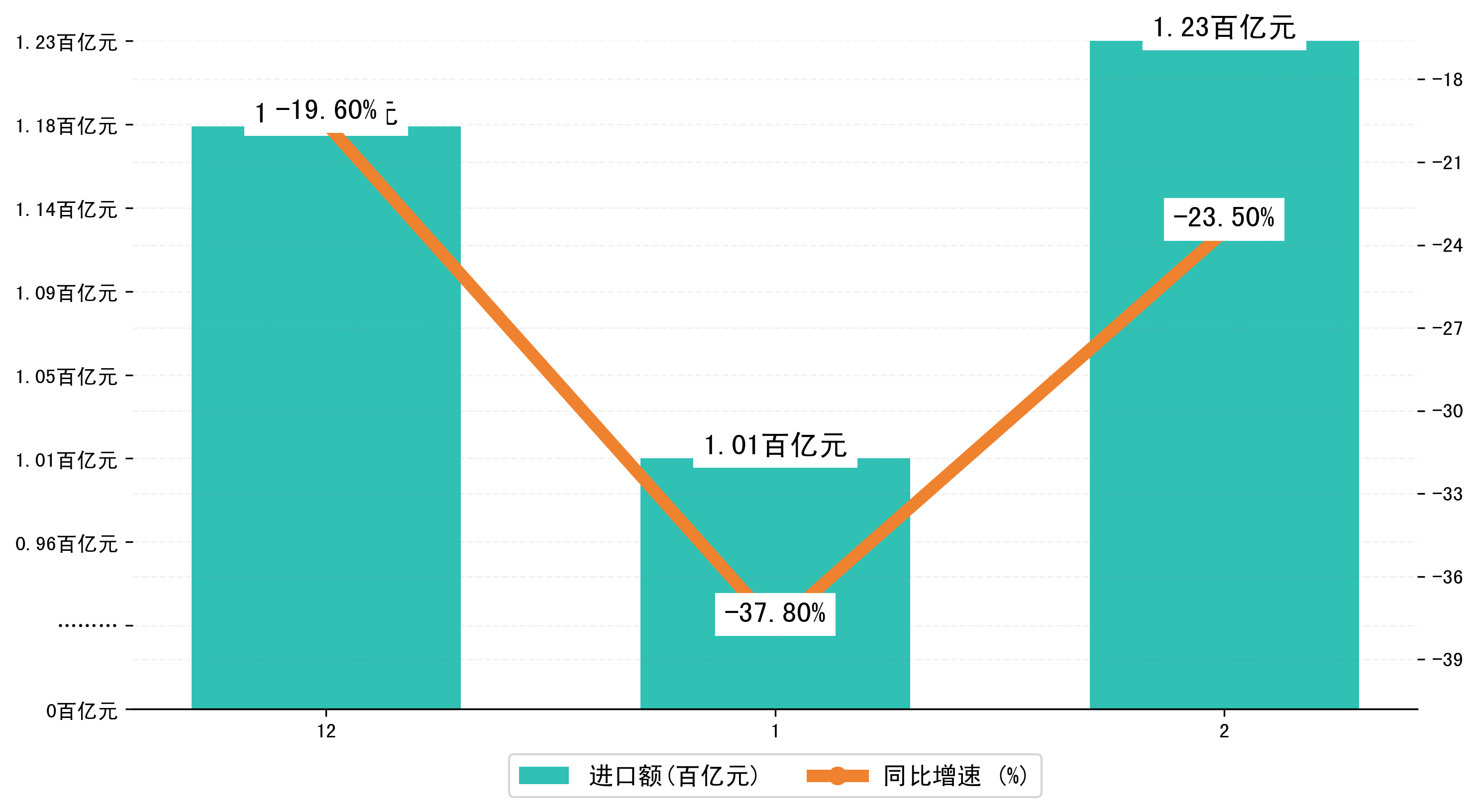 以人民币计,2023年2月西安市进口额为122,5088.8515万元,相比上月增加了21,7891.6769万元;相比上年同期减少了6,4047.4241万元,同比减少了-23.50%。