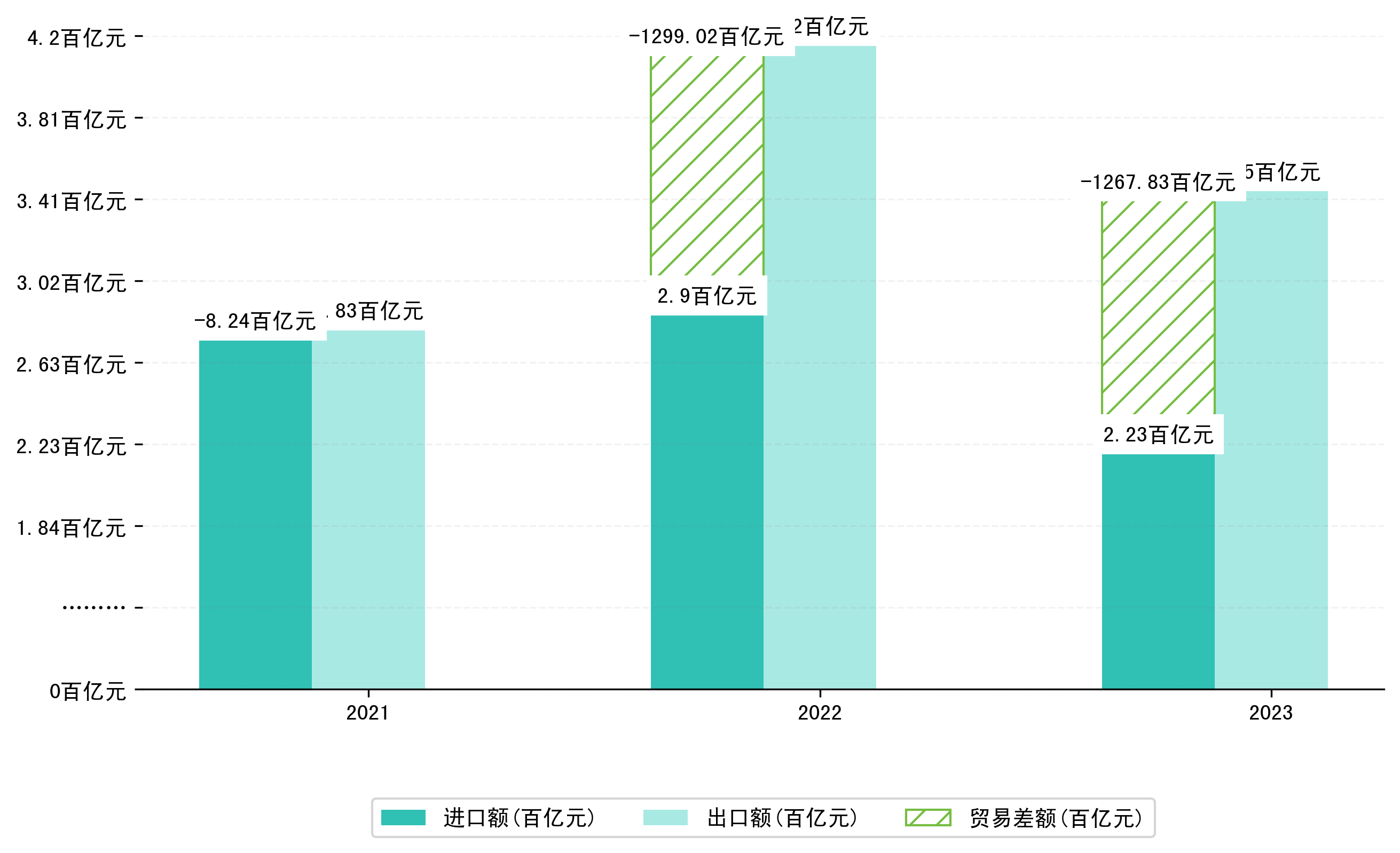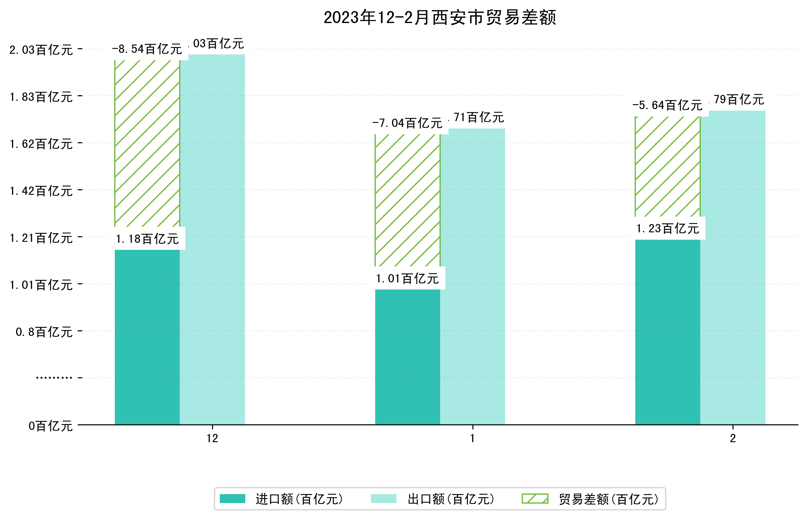 以人民币计,2023年1-2月西安市贸易差额为126,7833,2732万元(贸易顺差),相比上年同期减少了3,1186,8546万元,同比减少-2.4%。