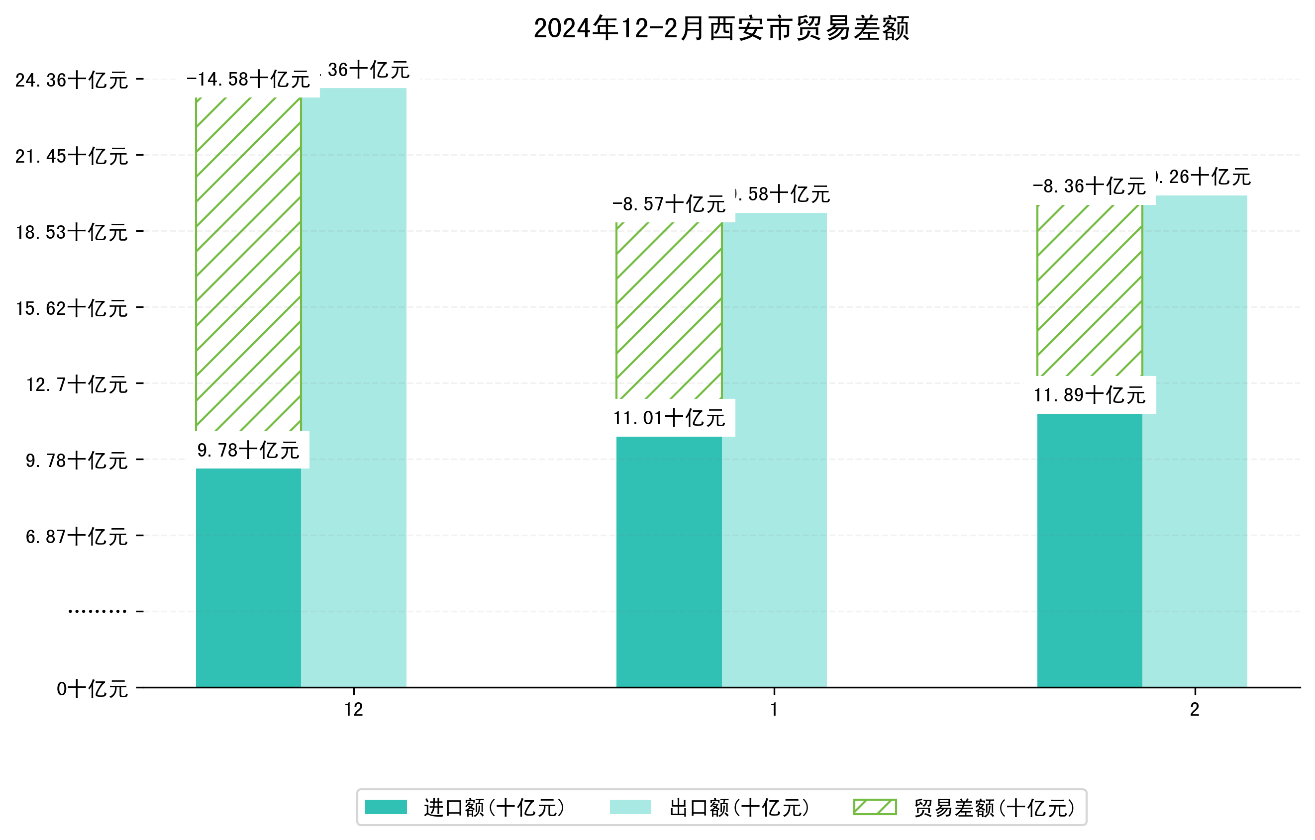 以人民币计,2024年2月西安市贸易差额为83,6402,4984万元(贸易顺差),相比上月减少了2,0202,4318万元,即2906,3420万美元;相比上年同期增加了27,2257,4634万元,同比增加48.26%。