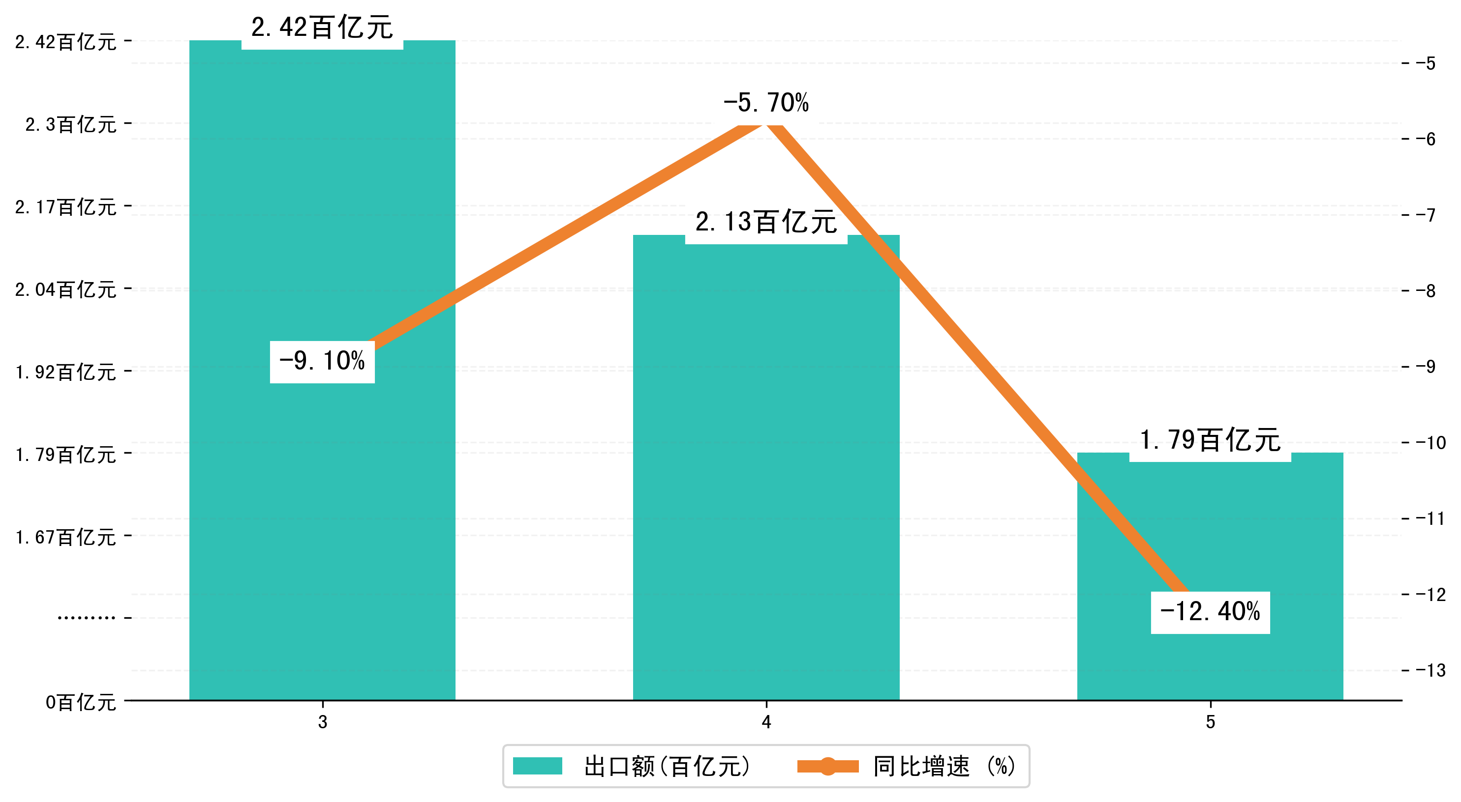 以人民币计,2023年5月西安市出口额为179,4338.759万元,相比上月减少了33,1017.3103万元;相比上年同期减少了91,6228.78万元,同比减少了-12.40%。