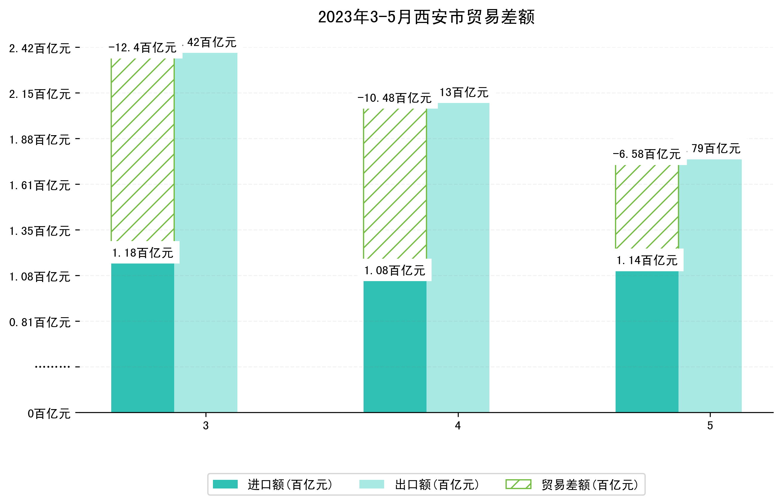 以人民币计,2023年1-5月西安市贸易差额为420,6100,2811万元(贸易顺差),相比上年同期增加了6198,1298万元,同比增加0.15%。