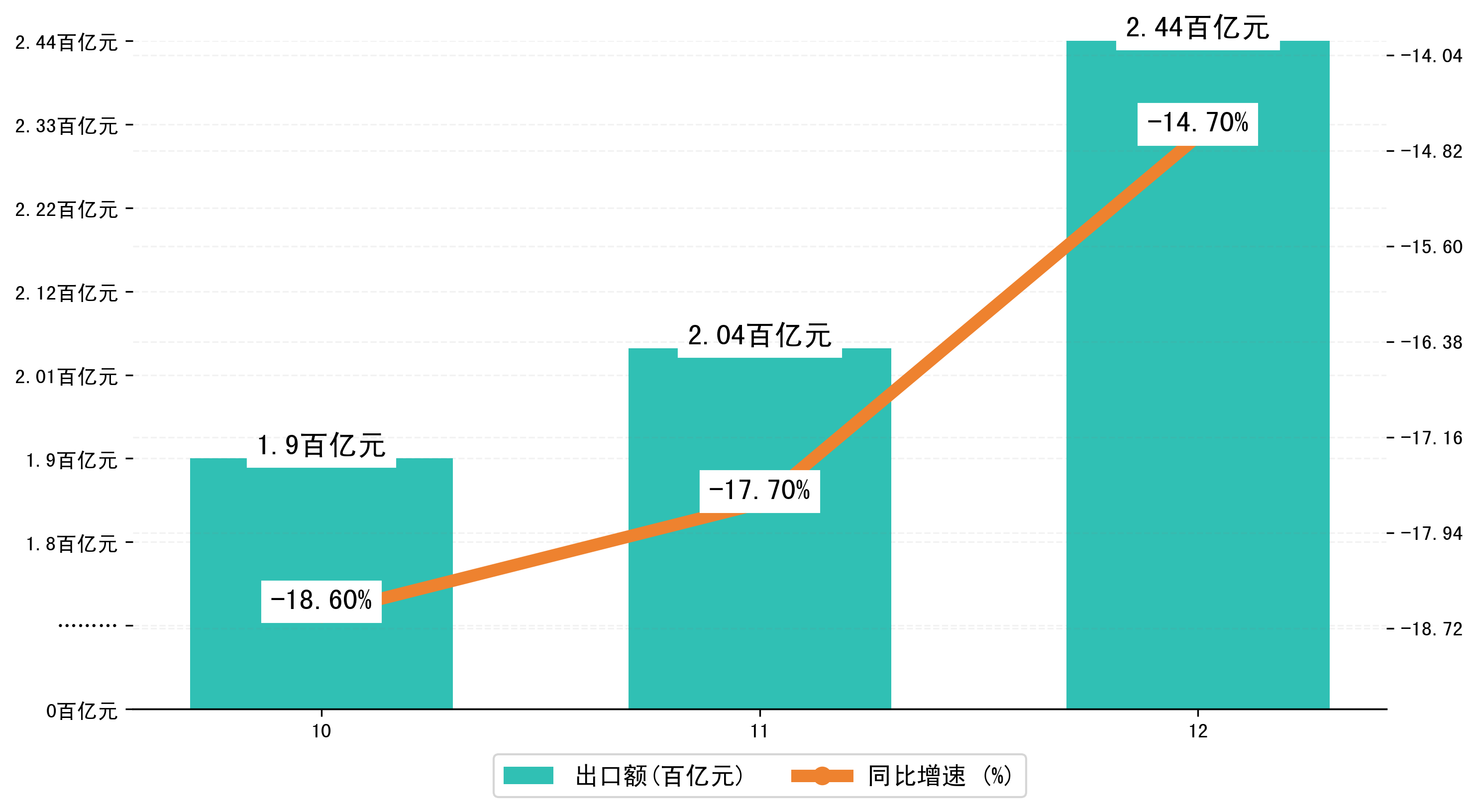 以人民币计,2023年1-12月西安市出口额为2333,9960.068万元,相比上年同期减少了413,5159.9365万元,同比减少了-14.70%。