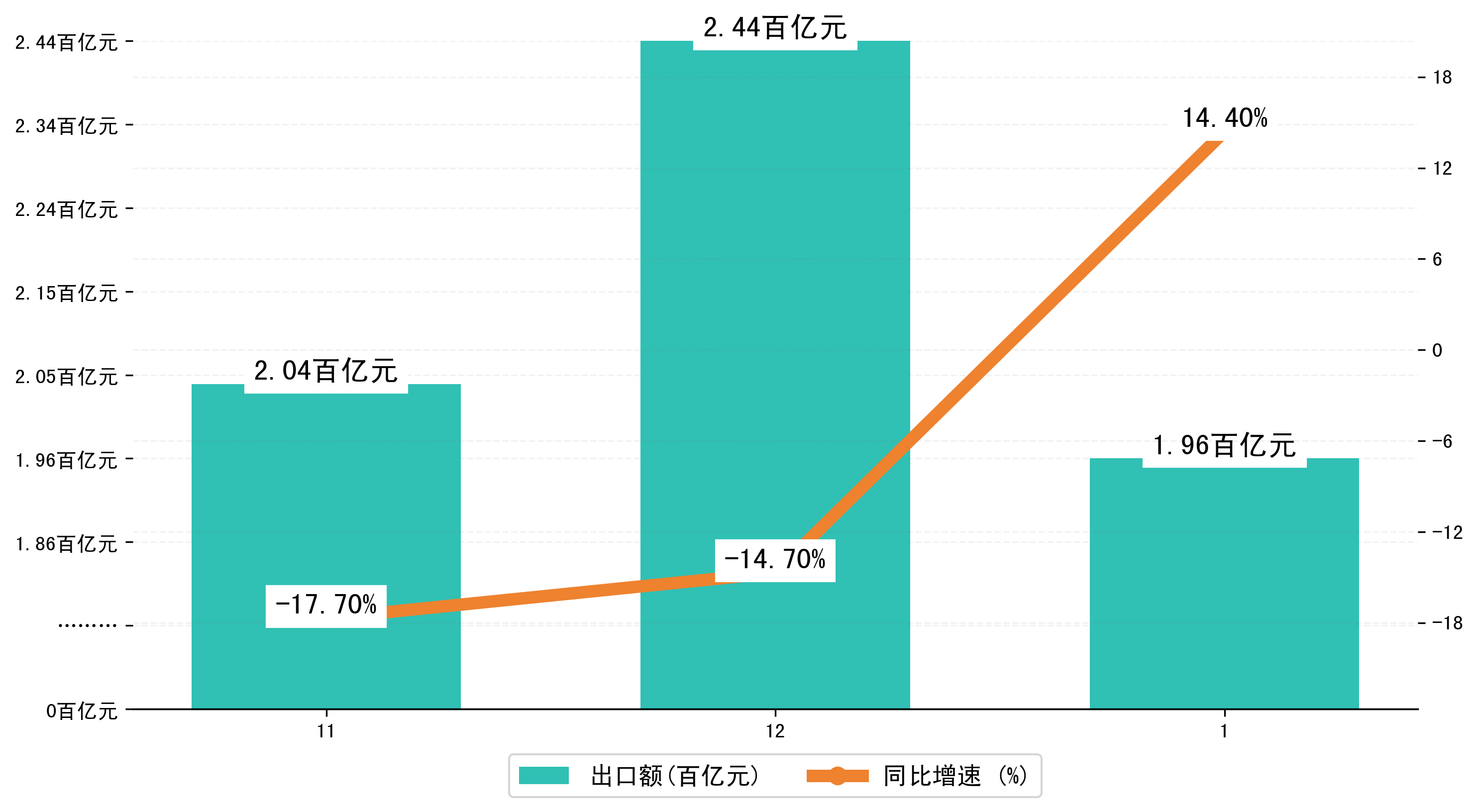 以美元计,2024年1-1月西安市出口额为27,5826.6829万美元,相比上年同期增加了3,0677.0367万美元,同比增加12.50%。