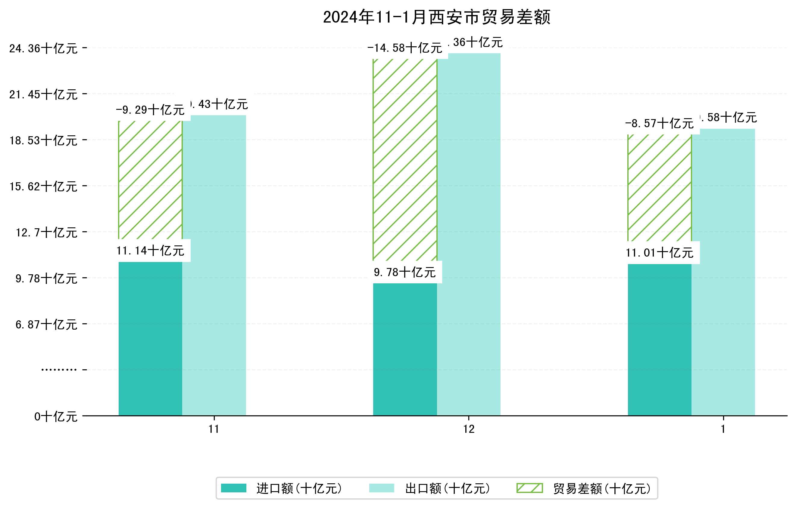 以美元计,2024年1-1月西安市贸易差额为12,0590,6664万美元(贸易顺差),相比上年同期增加了1,9892,2281万美元,同比增加19.75%。