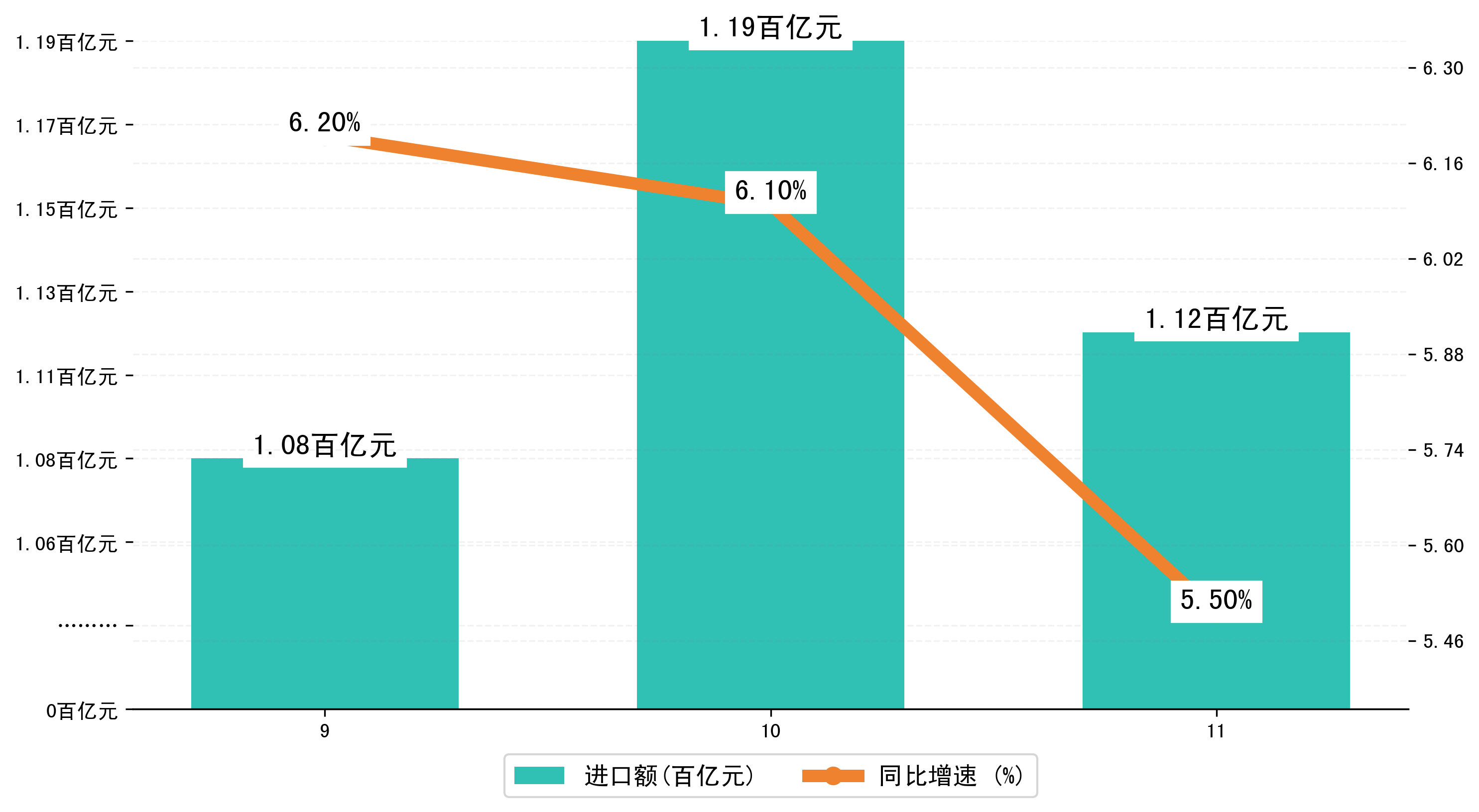 以人民币计,2024年11月西安市进口额为111,7855.9801万元,相比上月减少了7,6560.0552万元;相比上年同期增加了3367.7248万元,同比增加了5.50%。