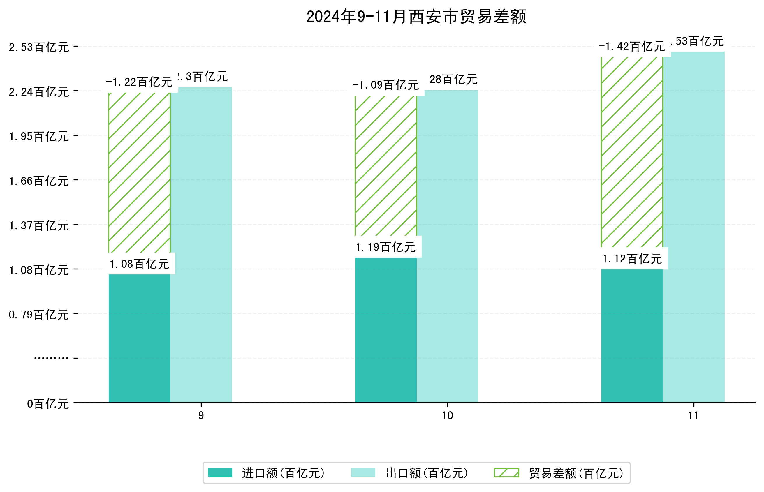 以美元计,2024年1-11月西安市贸易差额为183,6372,0015万美元(贸易顺差),相比上年同期增加了51,8436,5608万美元,同比增加39.34%。