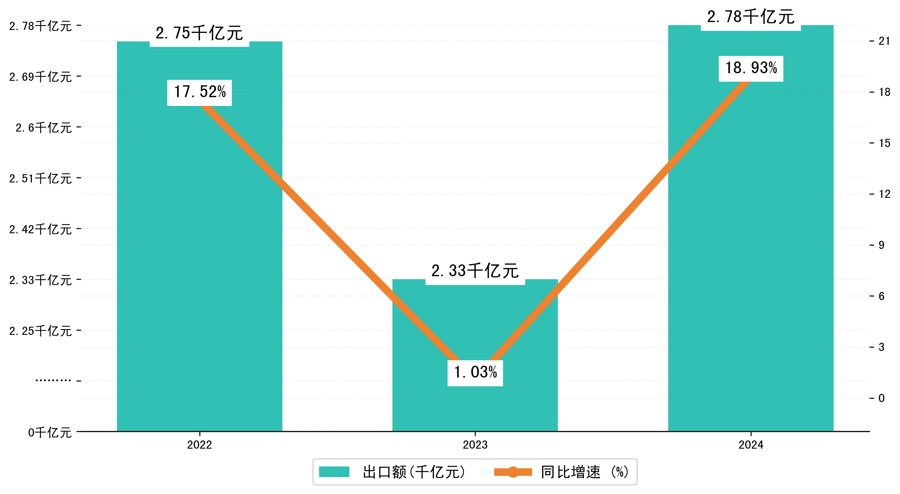 以人民币计,2024年1-12月西安市出口额为2775,7689.9293万元,相比上年同期增加了441,7729.8613万元,同比增加了18.90%。
