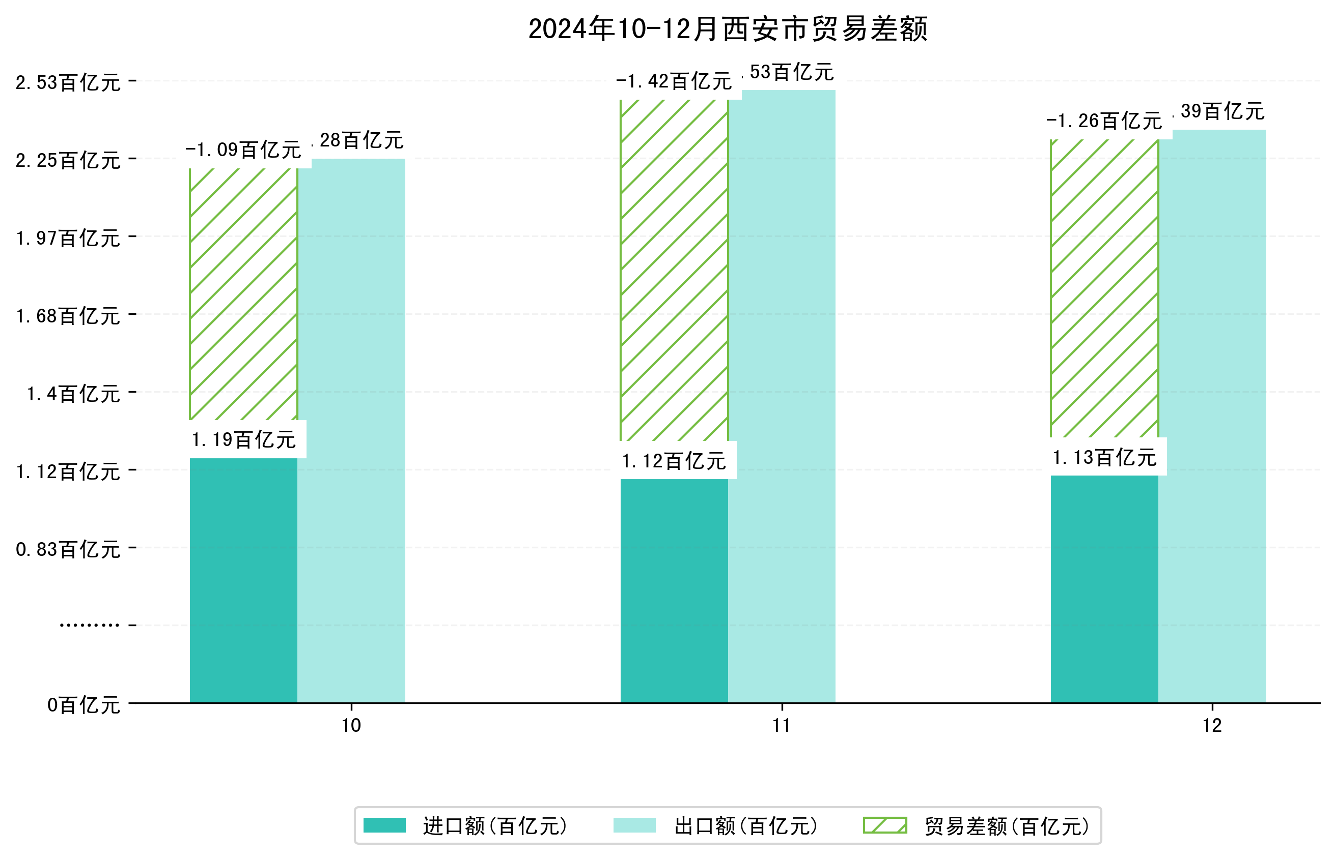 以人民币计,2024年12月西安市贸易差额为125,8622,6307万元(贸易顺差),相比上月减少了15,6689,6730万元,即2,3774,9842万美元;相比上年同期减少了19,8898,8084万元,同比减少-13.65%。