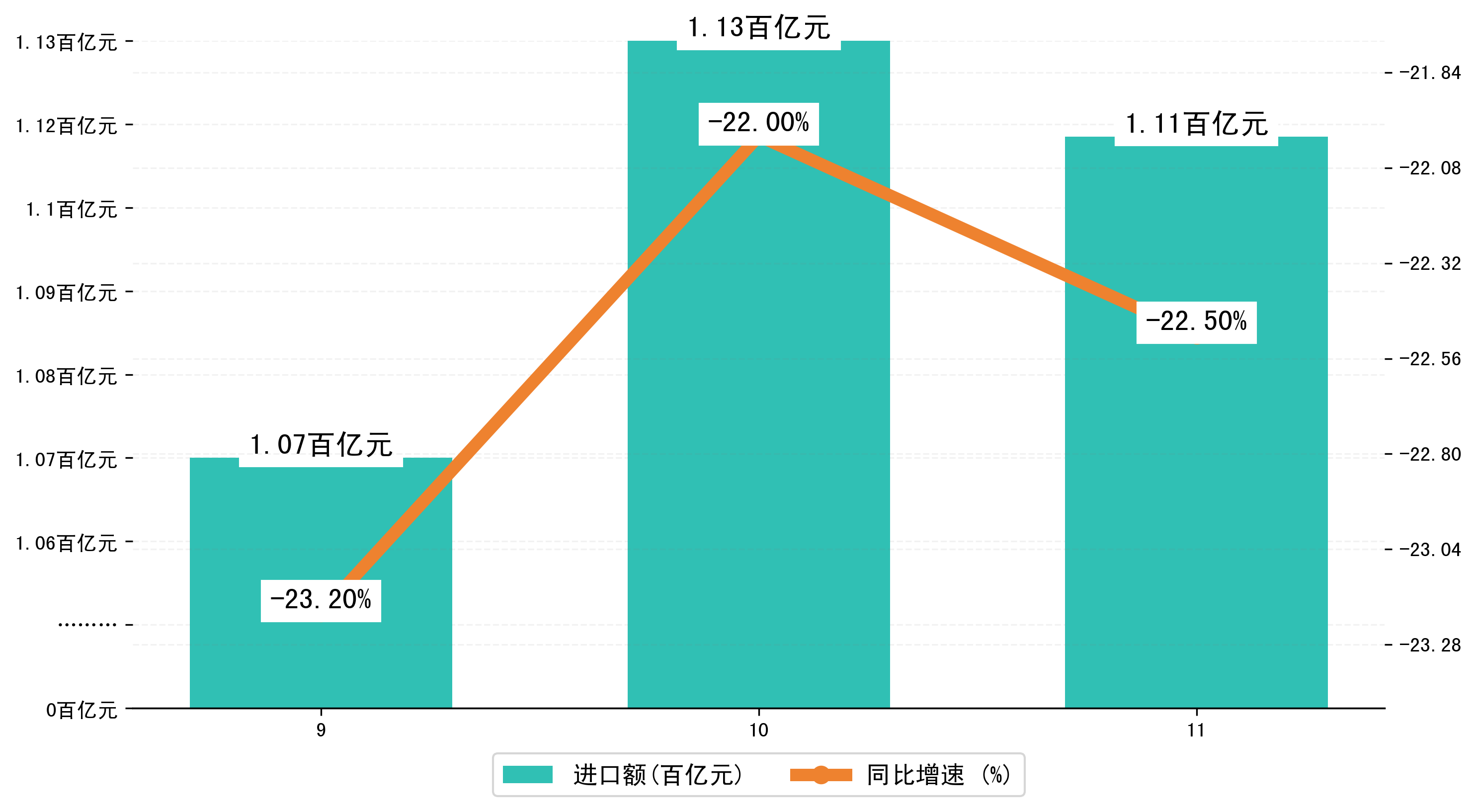 以人民币计,2023年11月西安市进口额为111,4488.2553万元,相比上月减少了1,3211.1504万元;相比上年同期减少了42,8659.7291万元,同比减少了-22.50%。