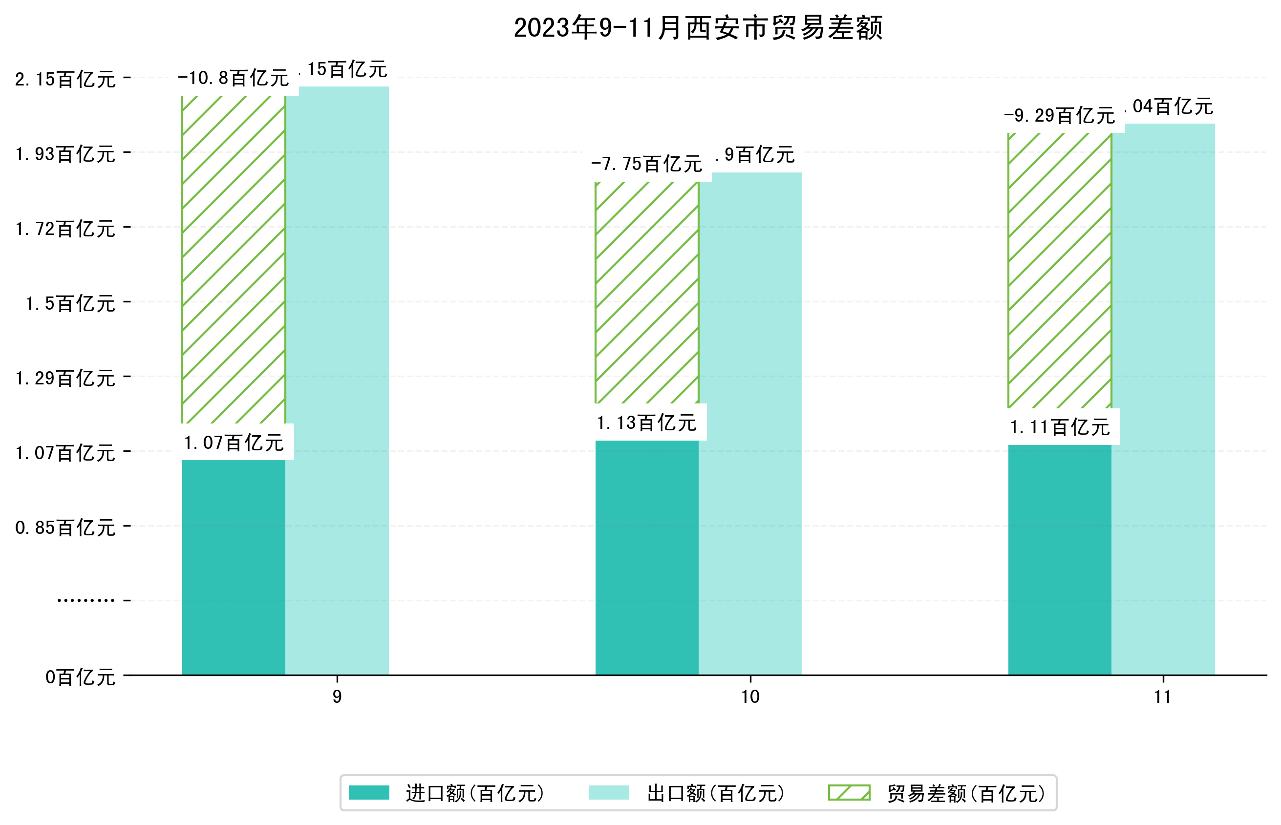 以美元计,2023年11月西安市贸易差额为12,9408,9931万美元(贸易顺差),相比上月增加了2,1395,1680万美元;相比上年同期增加了2,3402,3729万美元,同比增加22.08%。
