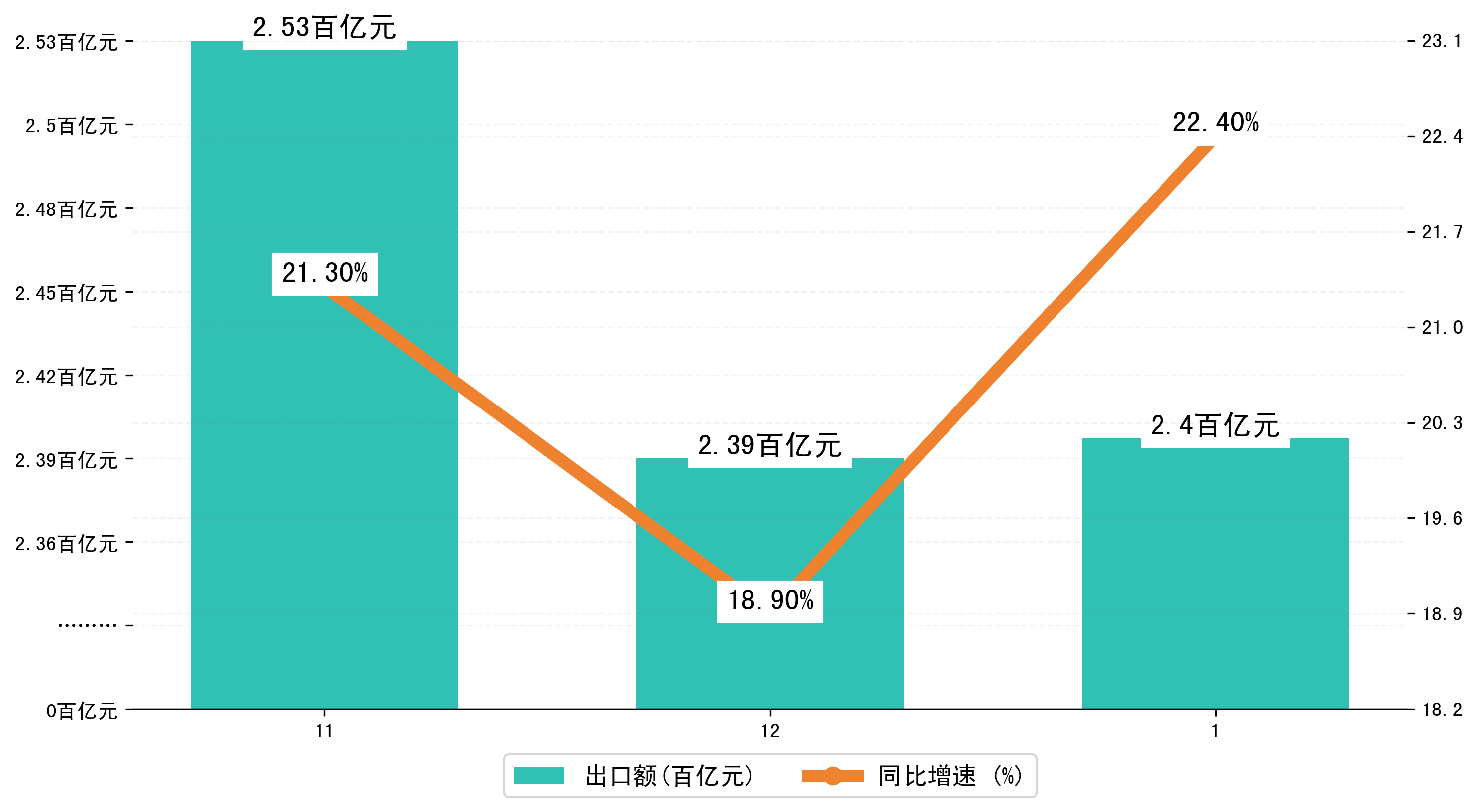 以人民币计,2025年1-1月西安市出口额为239,6401.6444万元,相比上年同期增加了43,8517.4504万元,同比增加了22.40%。