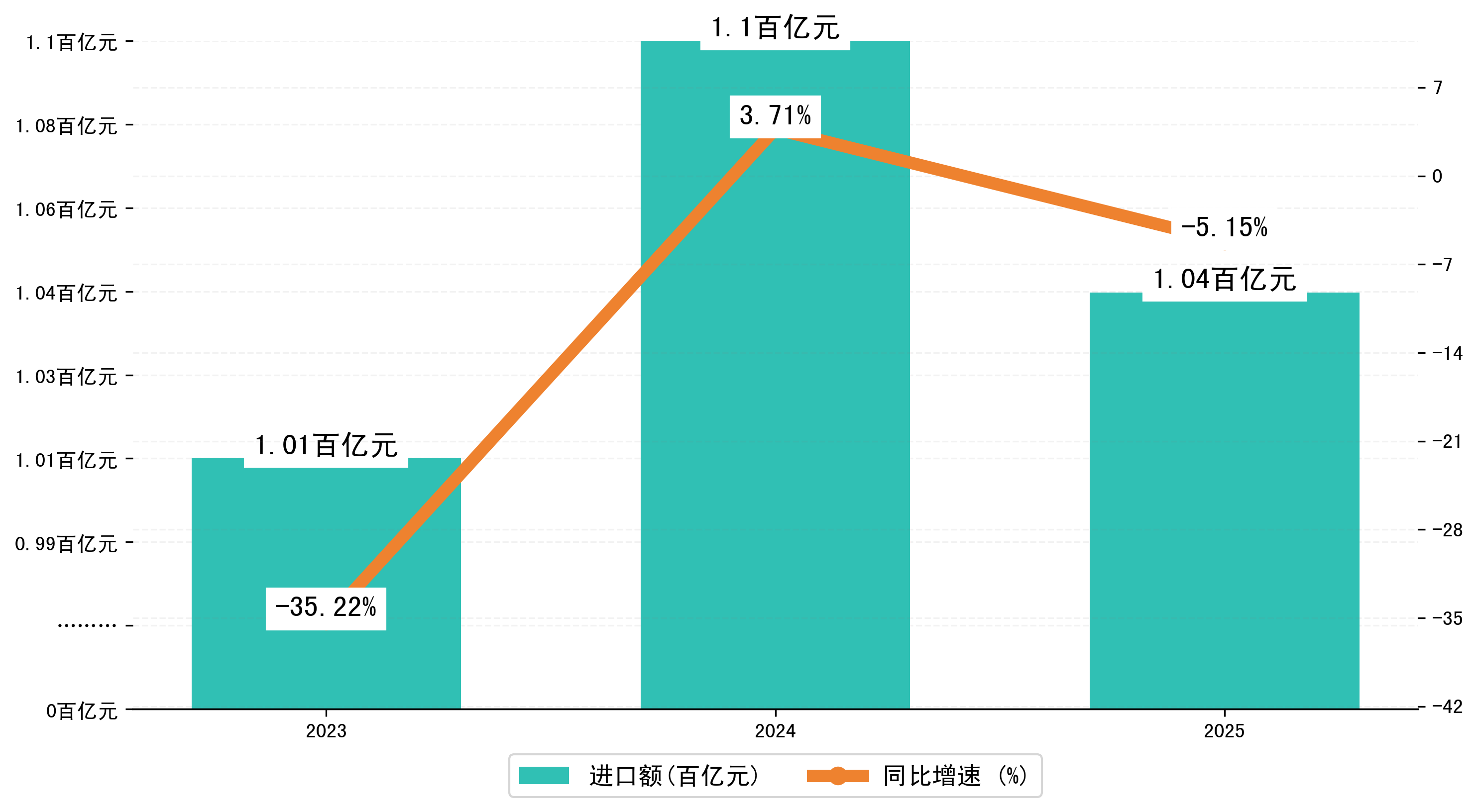 以人民币计,2025年1-1月西安市进口额为104,4607.6059万元,相比上年同期减少了5,6671.6579万元,同比减少了-4.60%。