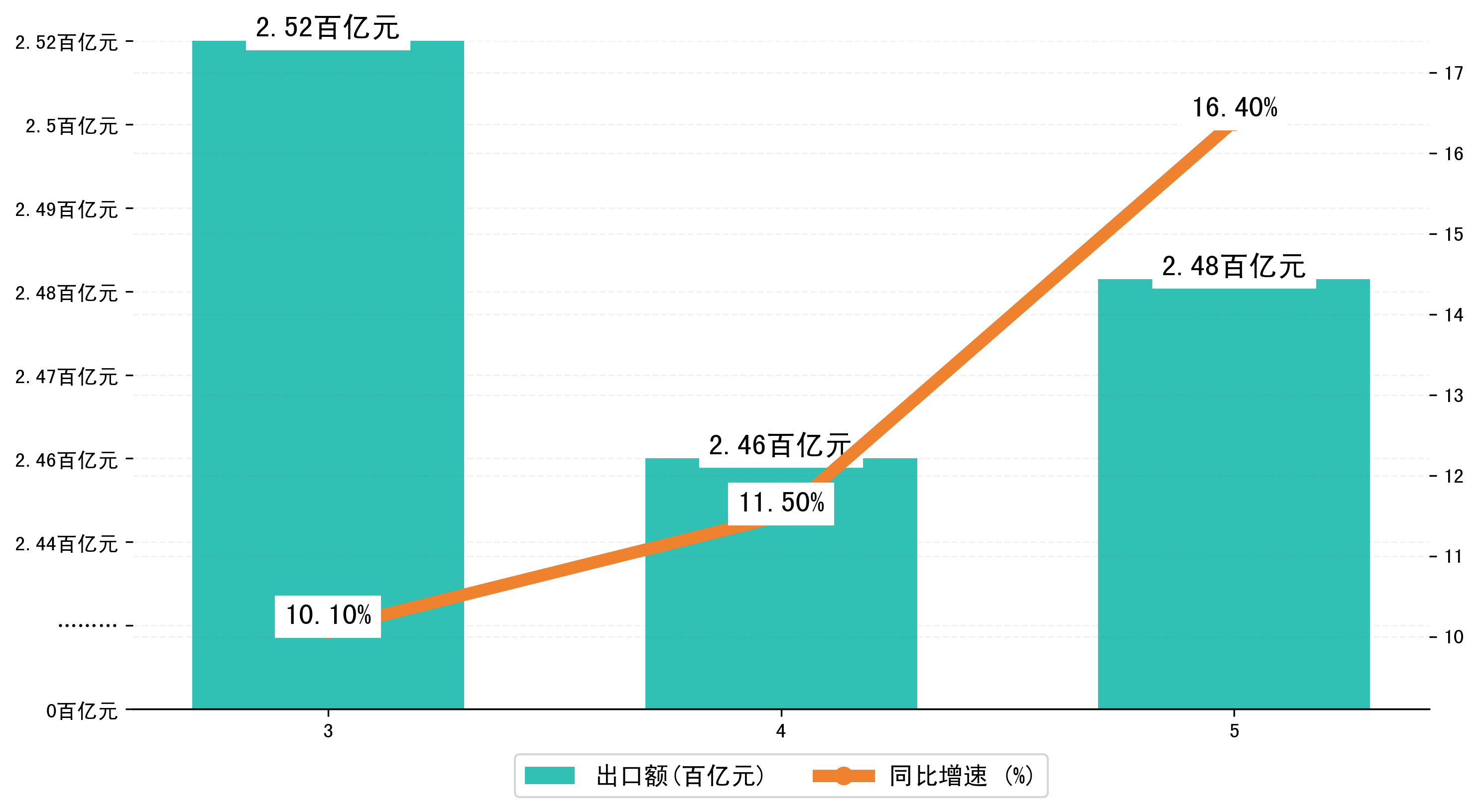 以人民币计,2024年5月西安市出口额为248,1344.695万元,相比上月增加了2,5851.5233万元;相比上年同期增加了68,7005.936万元,同比增加了16.40%。