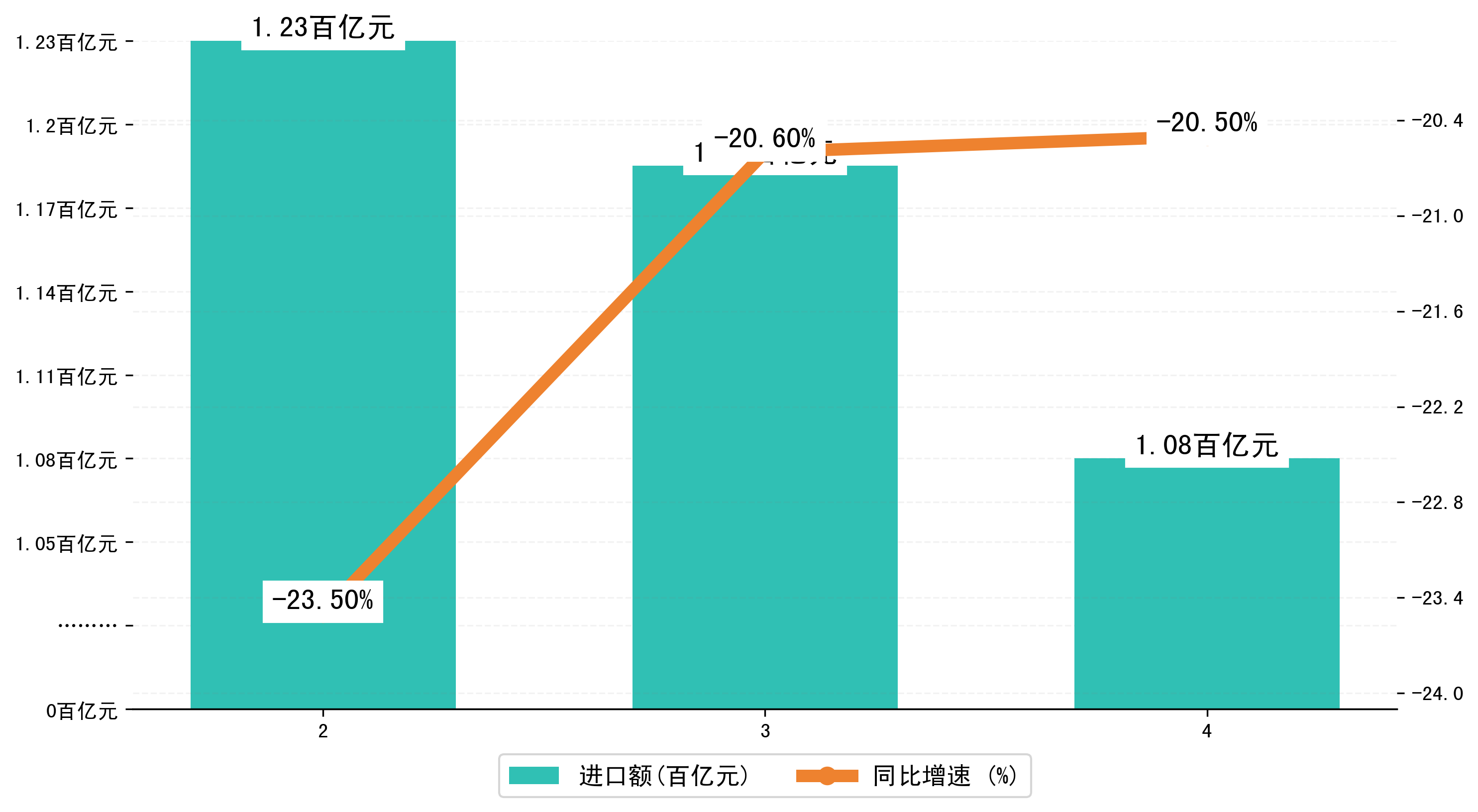 以人民币计,2023年1-4月西安市进口额为449,3120.8438万元,相比上年同期减少了113,3493.7412万元,同比减少了-20.50%。