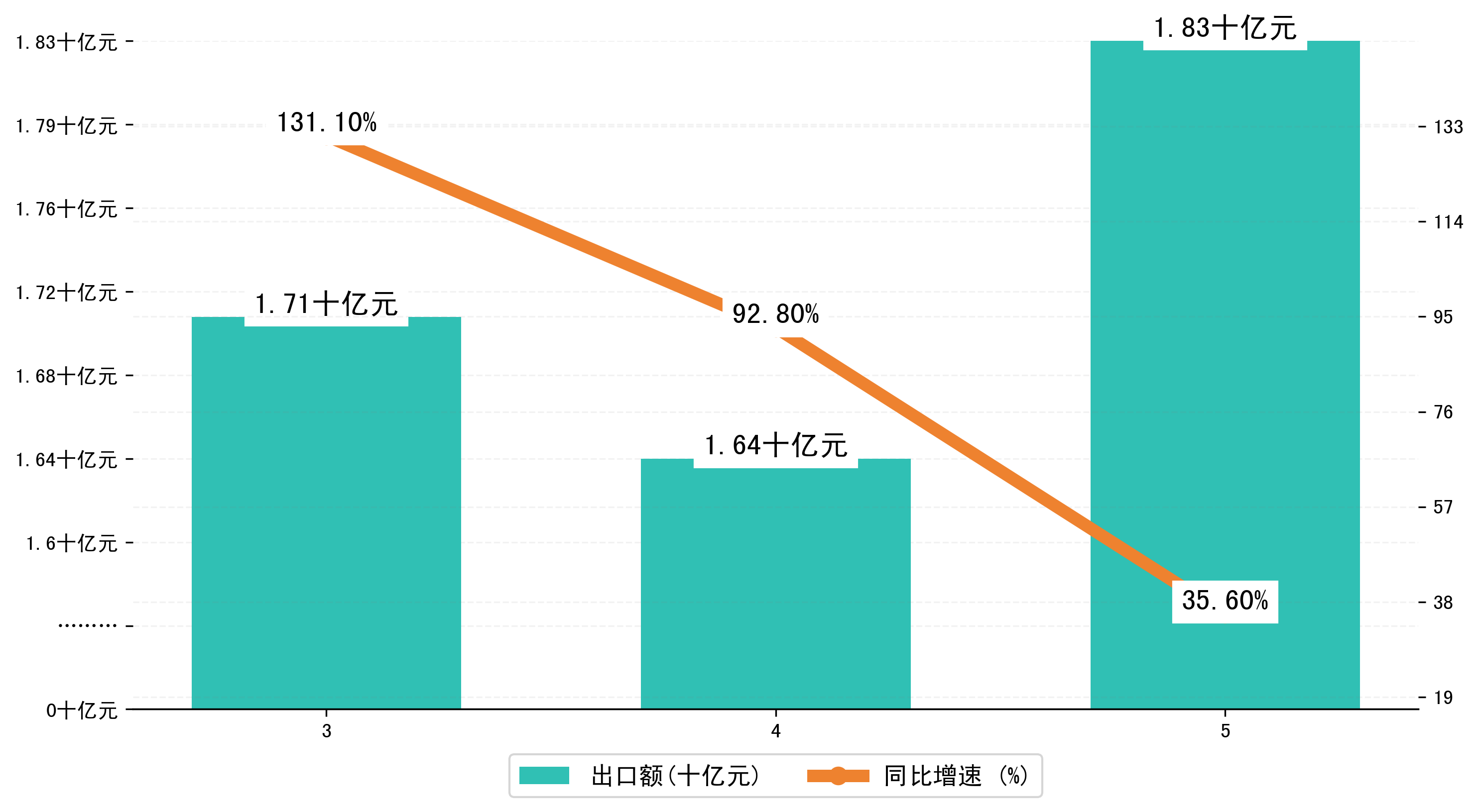 以美元计,2023年1-5月湘潭市出口额为12,5203.8254万美元,相比上年同期增加了2,5480.5342万美元,同比增加25.60%。