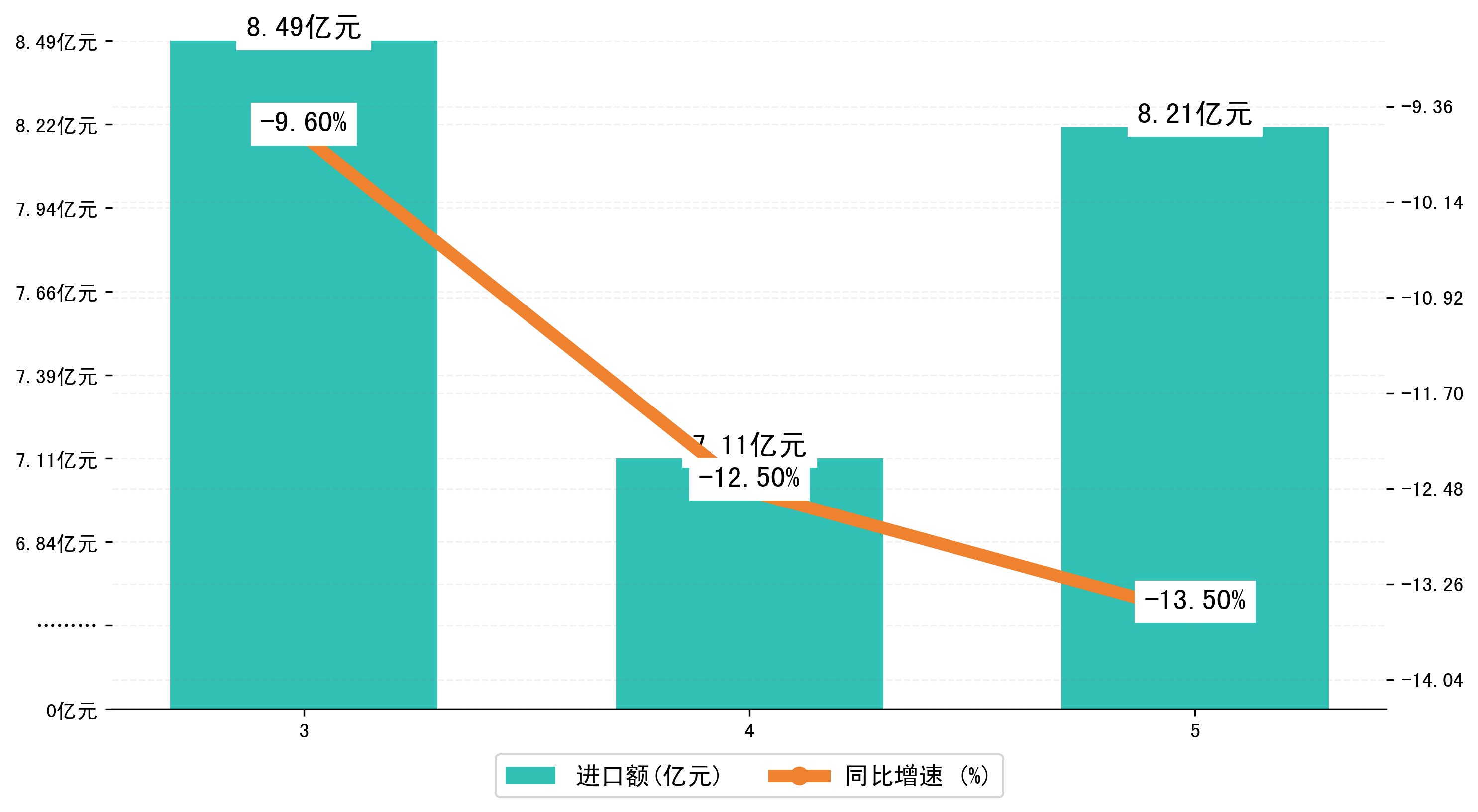 以人民币计,2023年5月湘潭市进口额为8,2070.6303万元,相比上月增加了1,0947.5801万元;相比上年同期减少了2,1320.6724万元,同比减少了-13.50%。