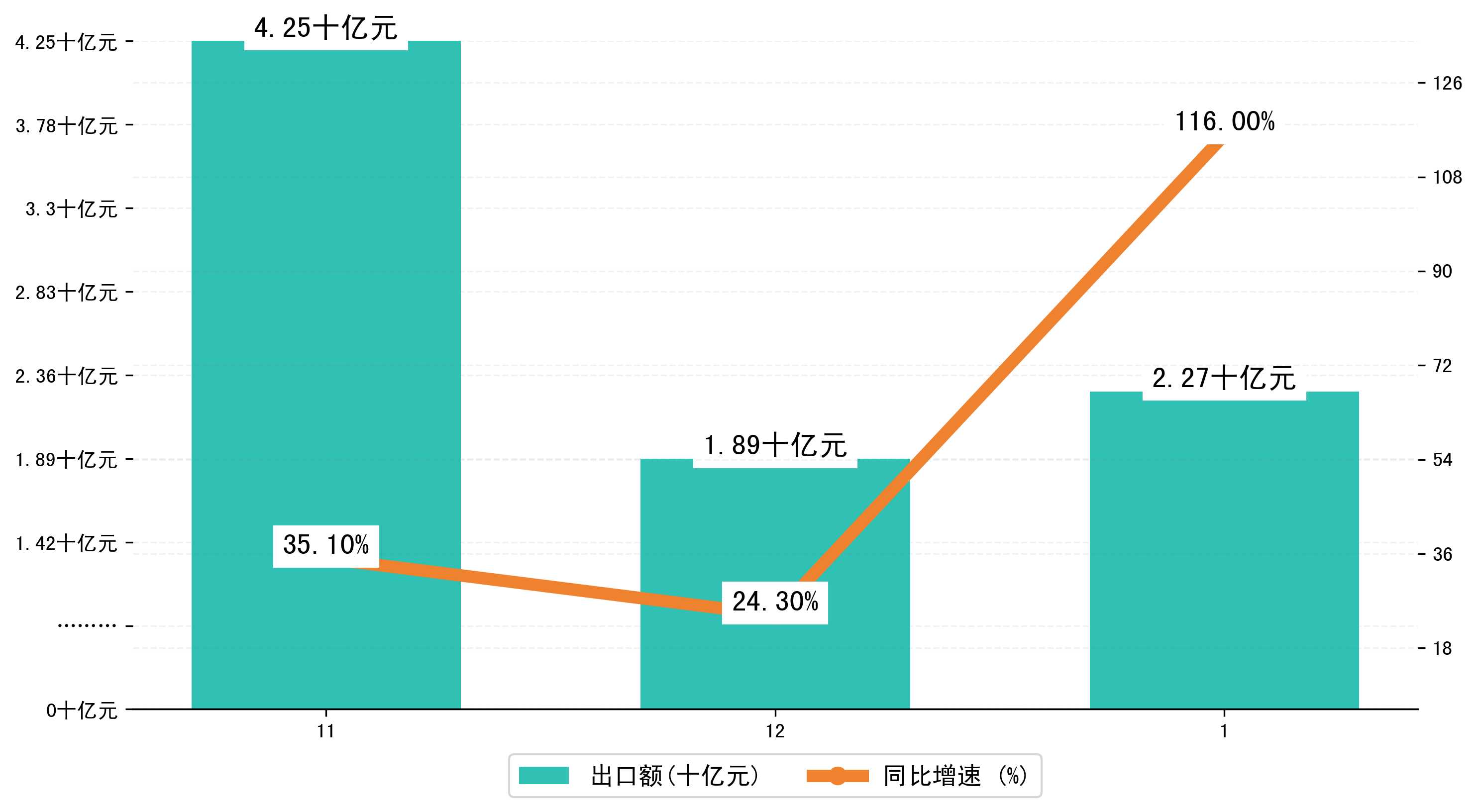 以人民币计,2023年1-1月湘潭市出口额为22,6868.9156万元,相比上年同期增加了12,1860.3702万元,同比增加了116.00%。