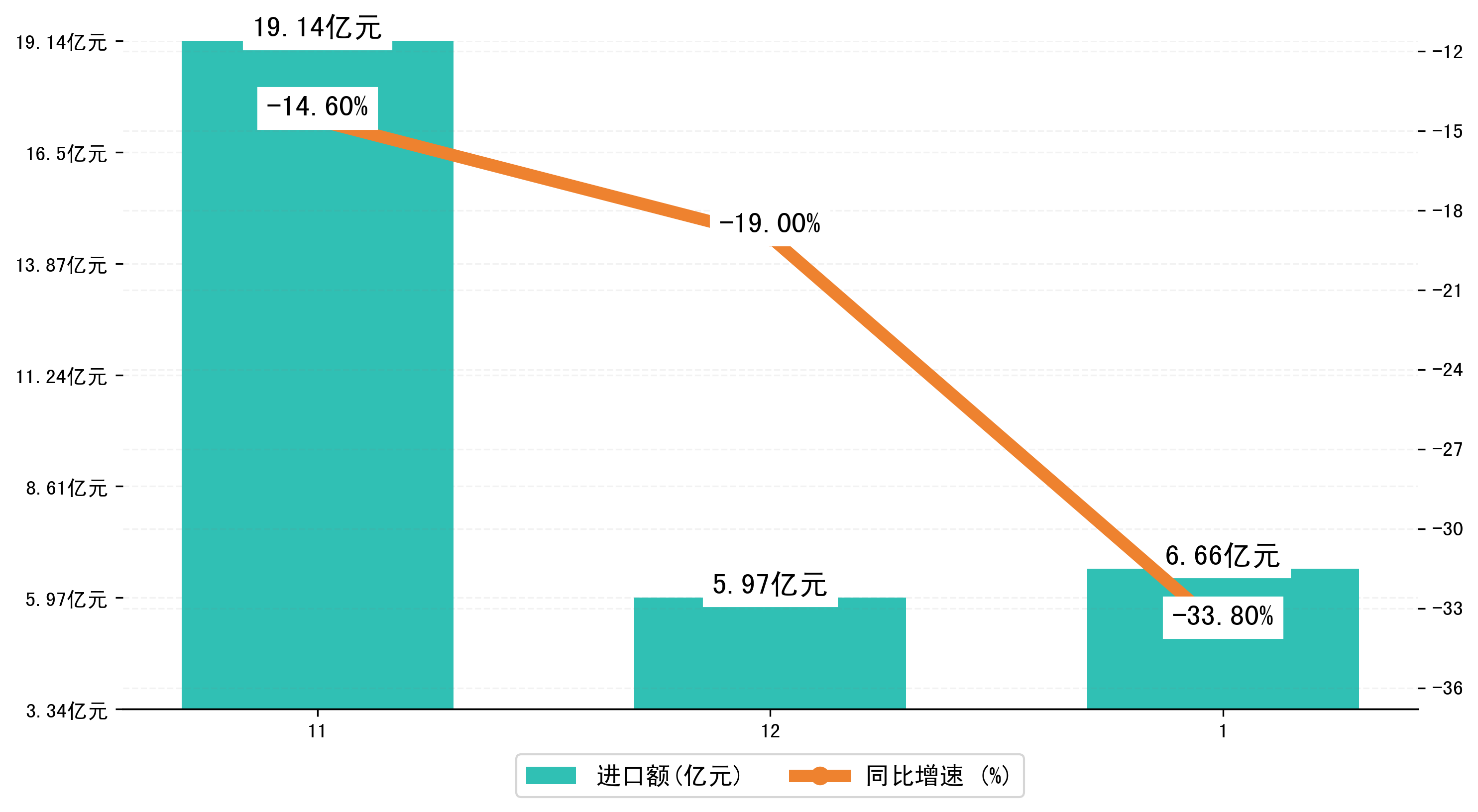 以人民币计,2023年1-1月湘潭市进口额为6,6639.4115万元,相比上年同期减少了2,1180.5016万元,同比减少了-33.80%。