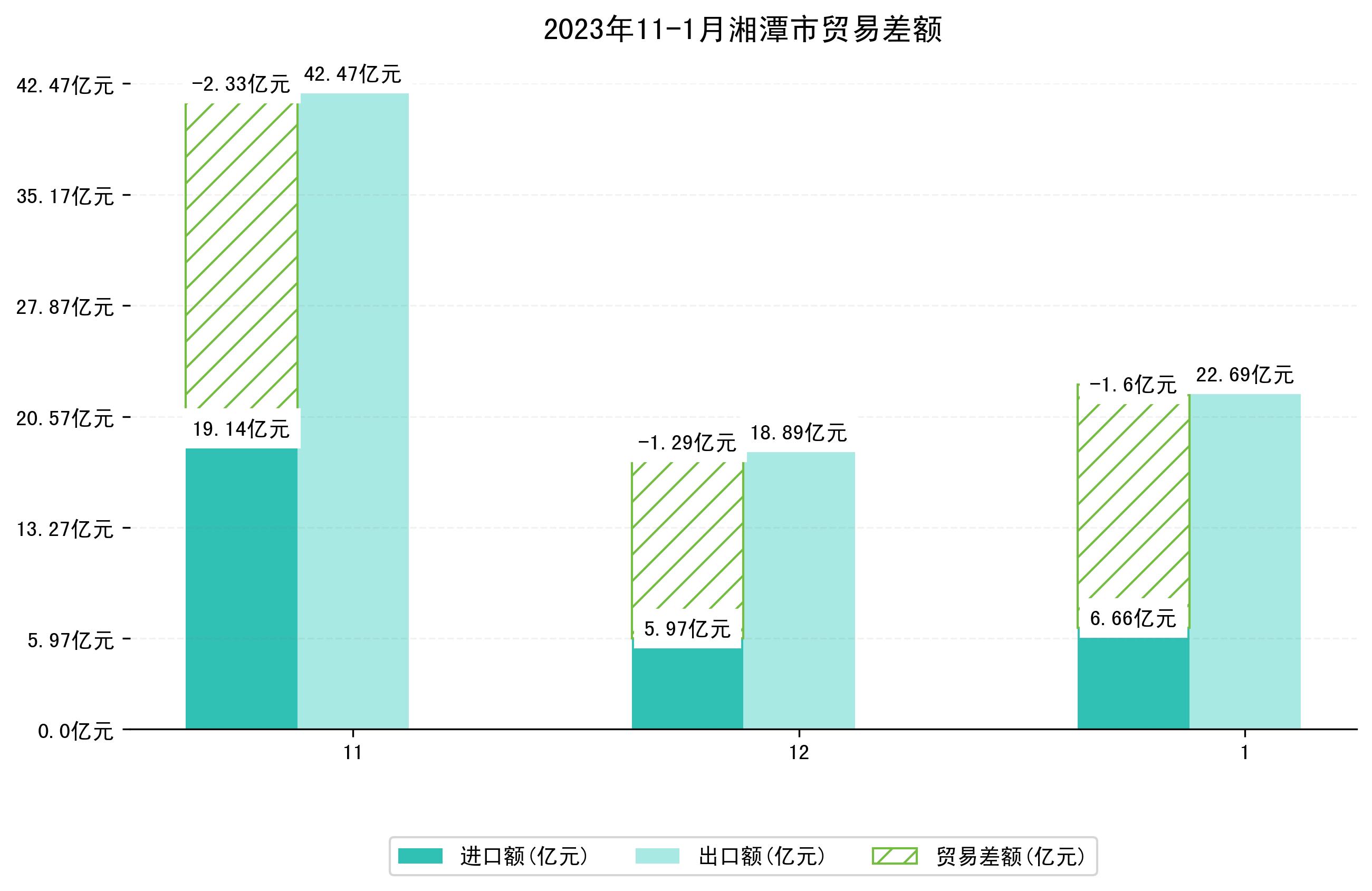 以人民币计,2023年1-1月湘潭市贸易差额为16,0229,5041万元(贸易顺差),相比上年同期增加了14,3040,8718万元,同比增加832.18%。