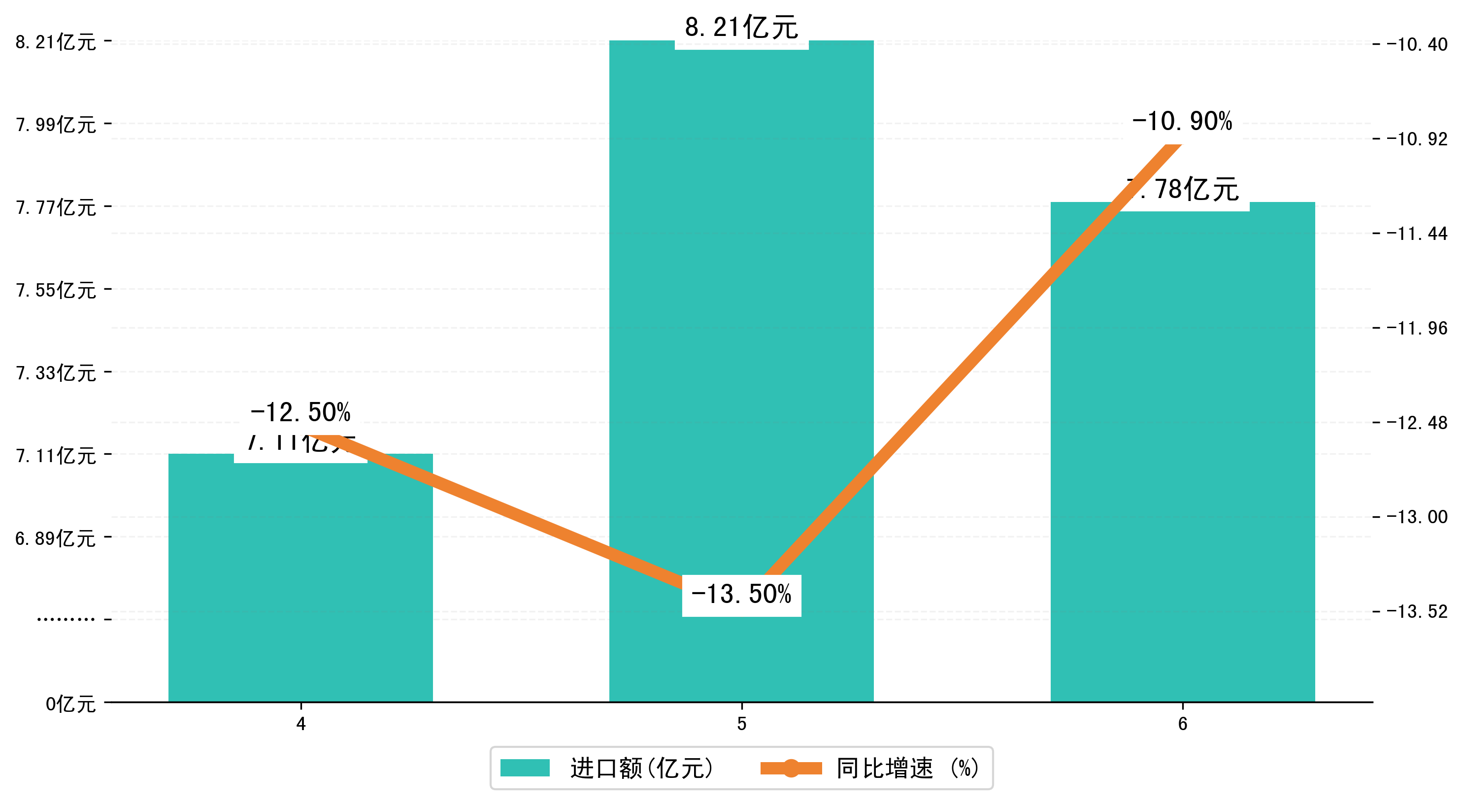 以人民币计,2023年1-6月湘潭市进口额为46,1719.1713万元,相比上年同期减少了6,2360.993万元,同比减少了-10.90%。