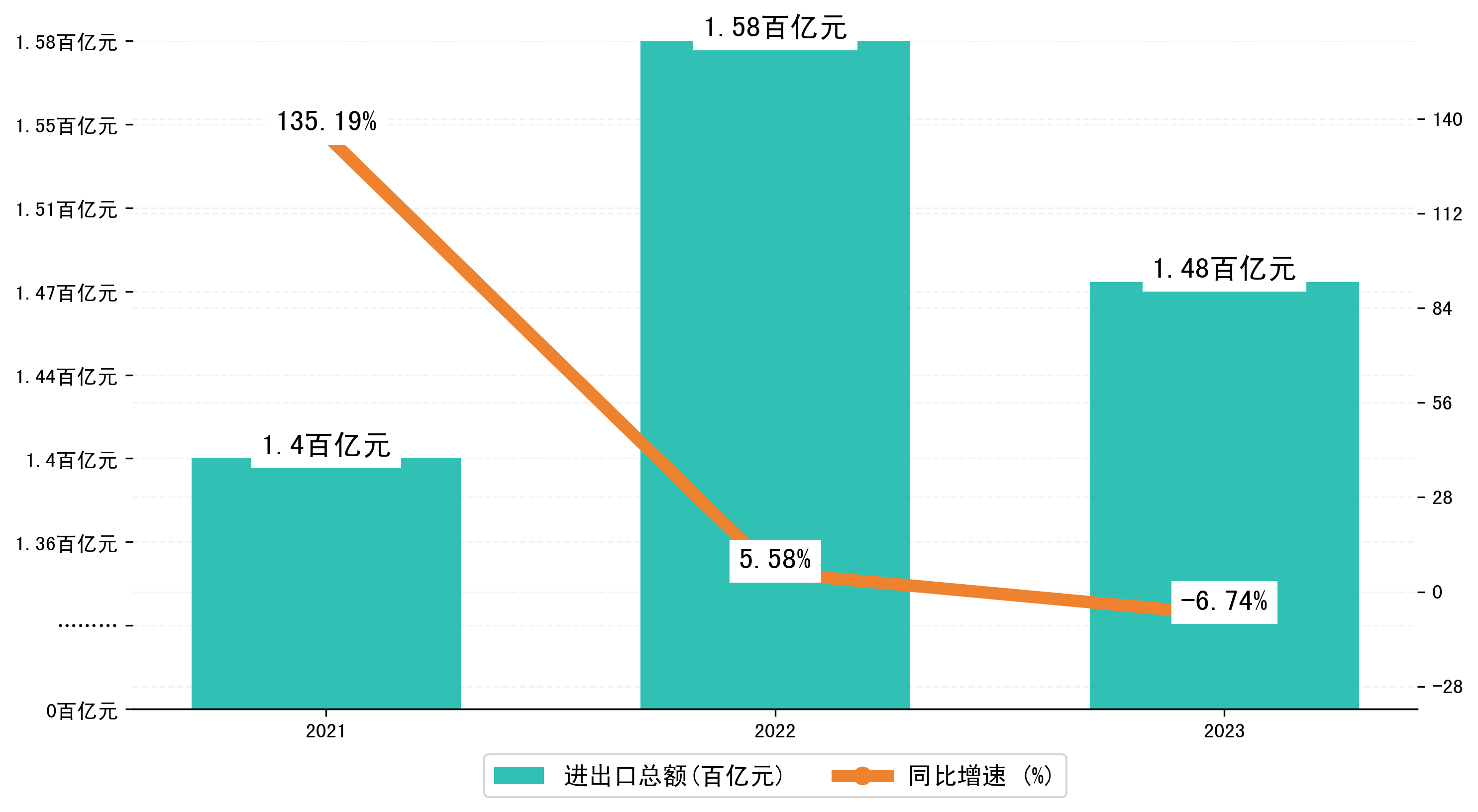 以人民币计,2023年1-6月湘潭市进出口总额为147,6437.232万元,相比上年同期减少了10,6649.2925万元,同比减少了-6.30%。