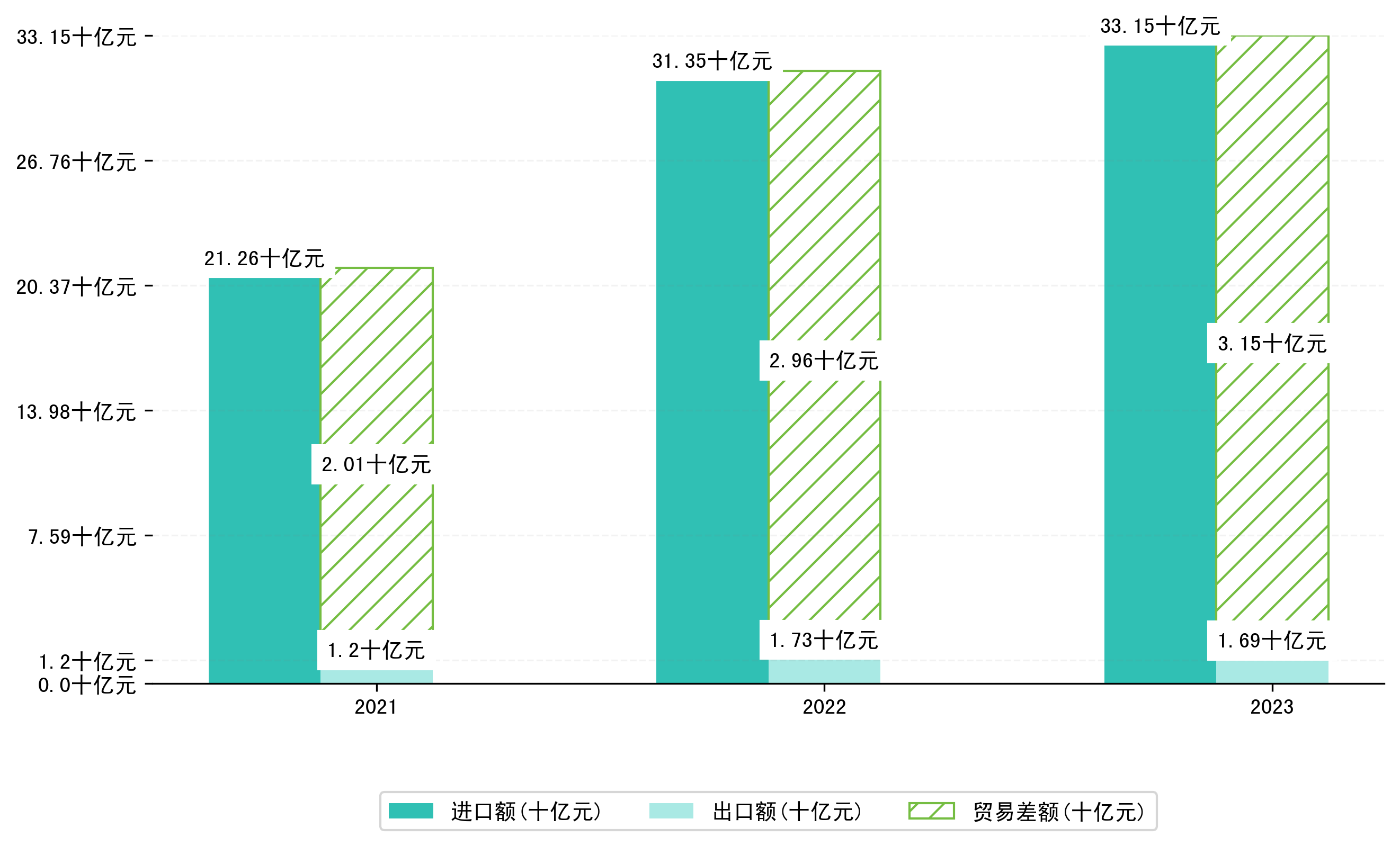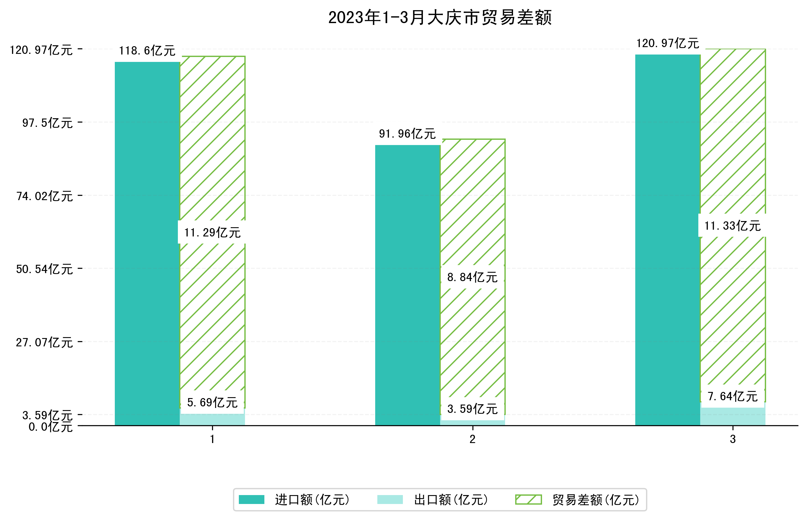 以人民币计,2023年3月大庆市贸易差额为113,3342,0745万元(贸易逆差),相比上月减少了24,9675,4010万元,即3,5533,0994万美元;相比上年同期减少了11,9642,5652万元,同比减少11.8%。