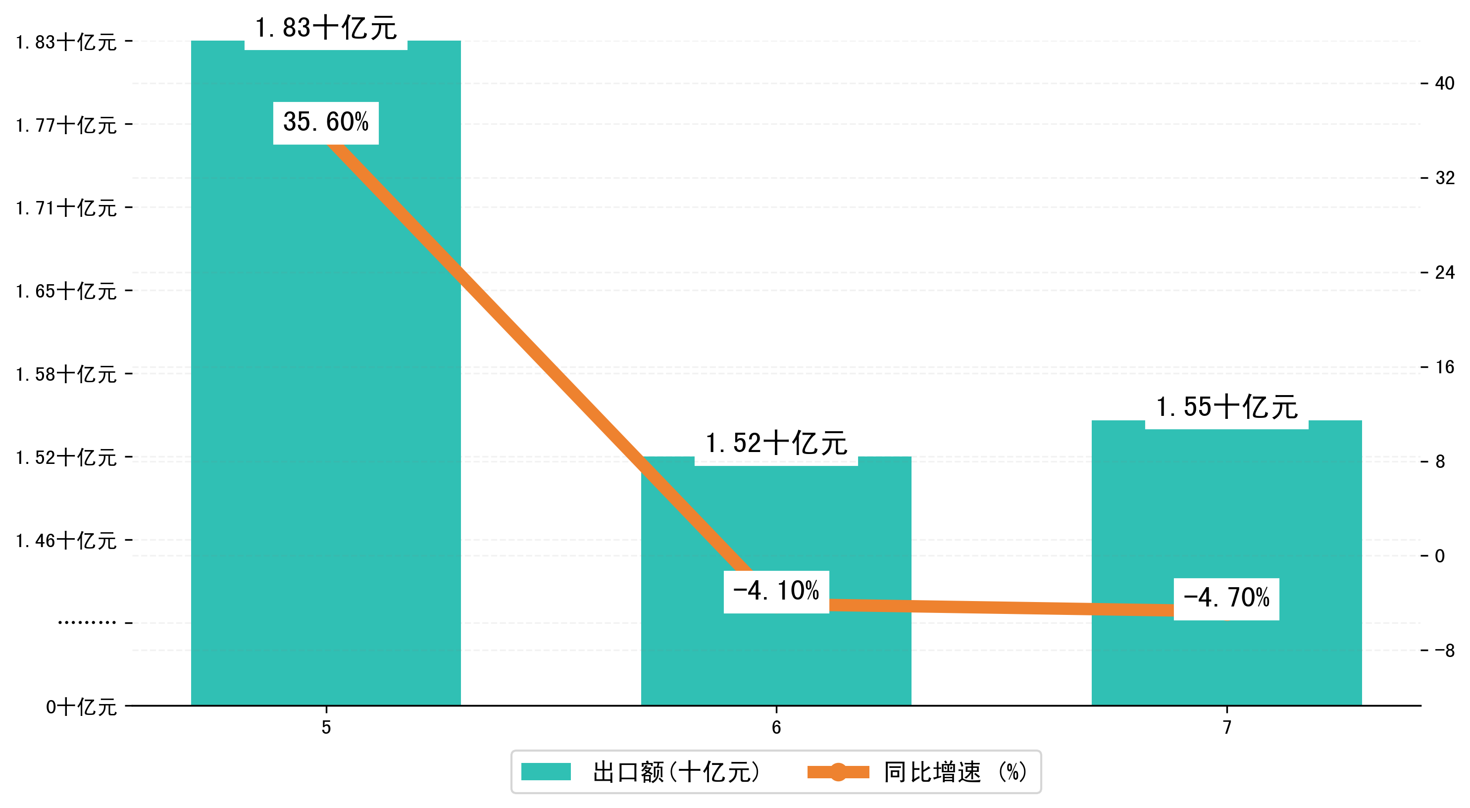 以人民币计,2023年1-7月湘潭市出口额为116,9534.8768万元,相比上年同期减少了7,9419.8528万元,同比减少了-4.70%。