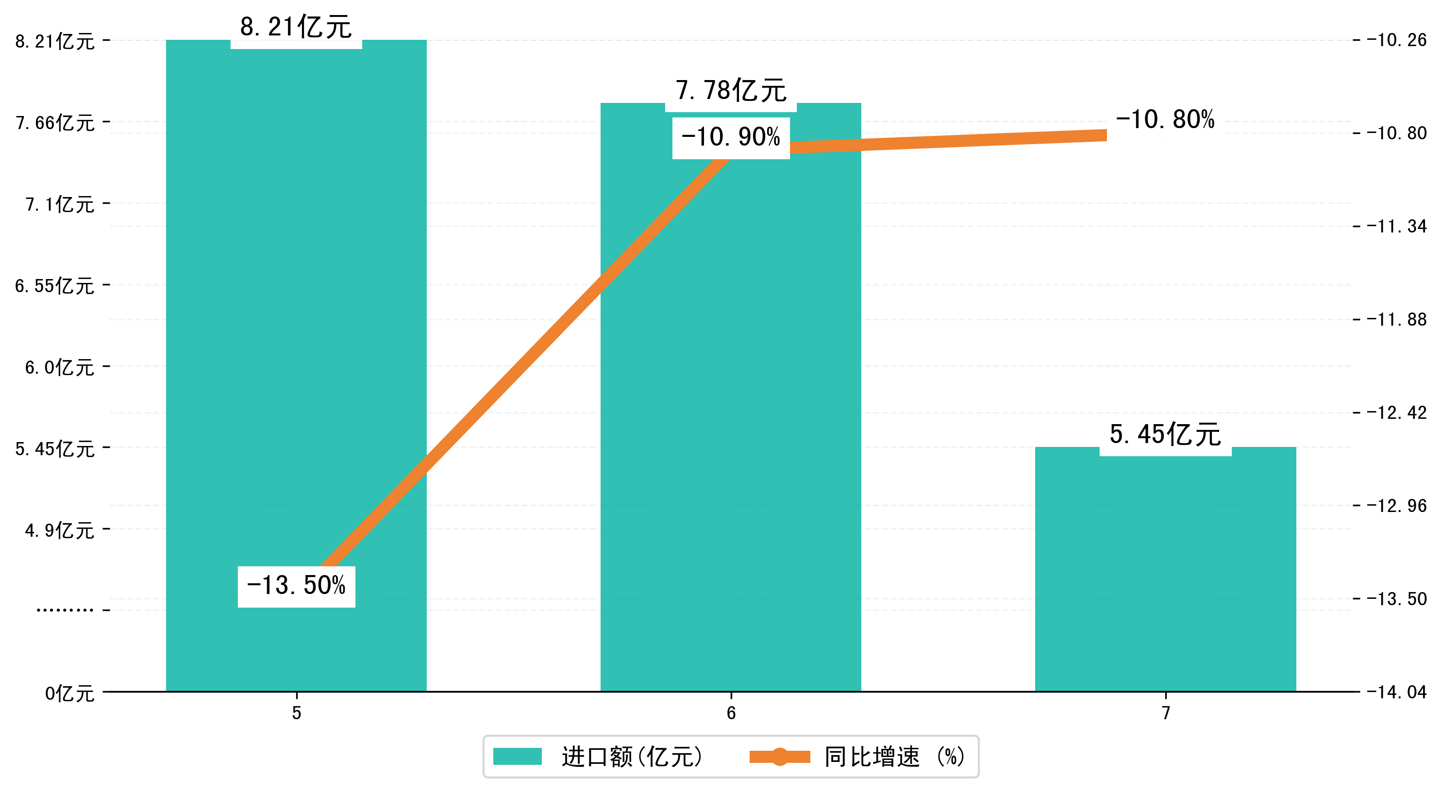 以人民币计,2023年1-7月湘潭市进口额为52,3264.6779万元,相比上年同期减少了8,2687.1692万元,同比减少了-10.80%。