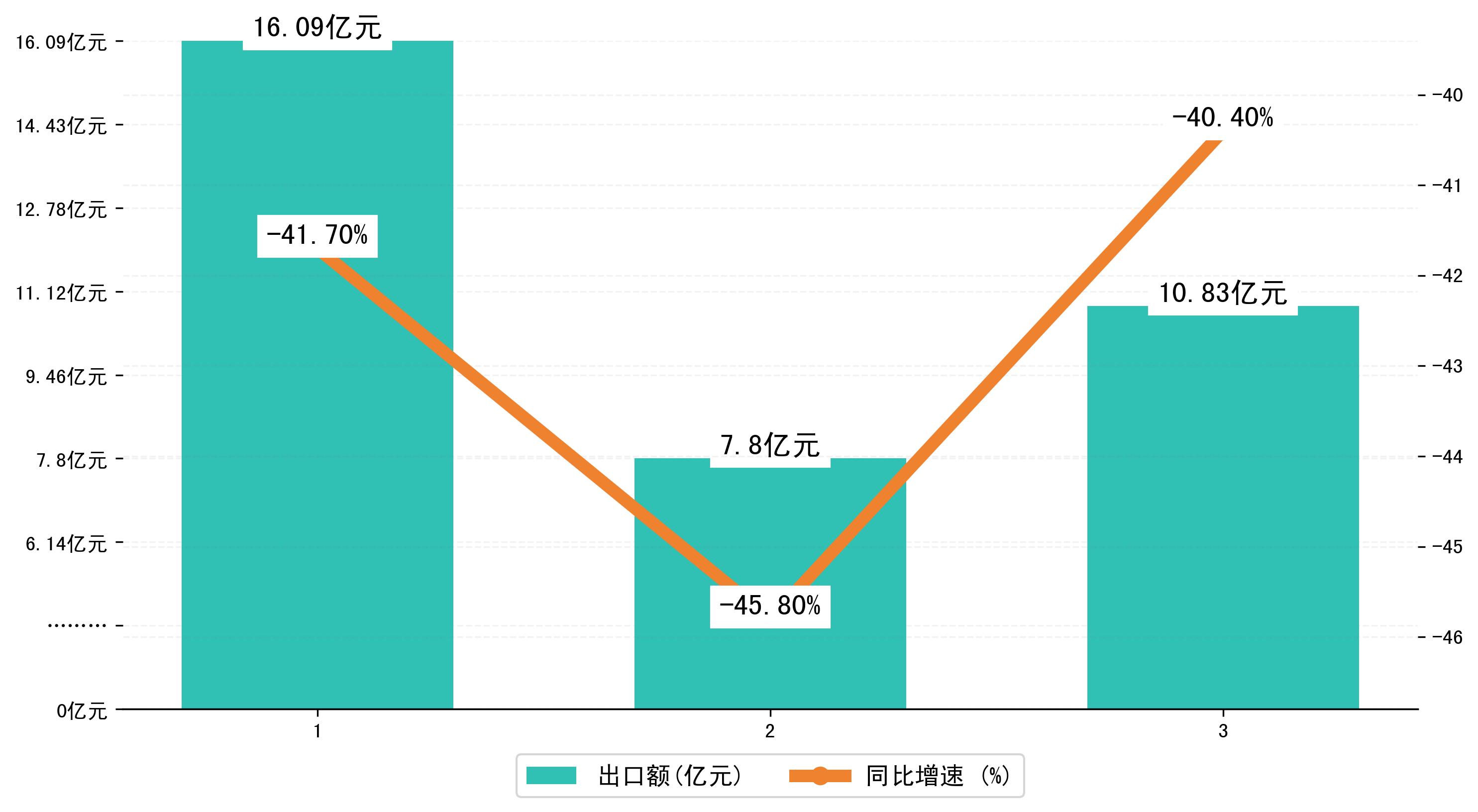 以美元计,2025年1-3月湘潭市出口额为4,8337.3449万美元,相比上年同期减少了3,3667.7032万美元,同比减少-41.00%。