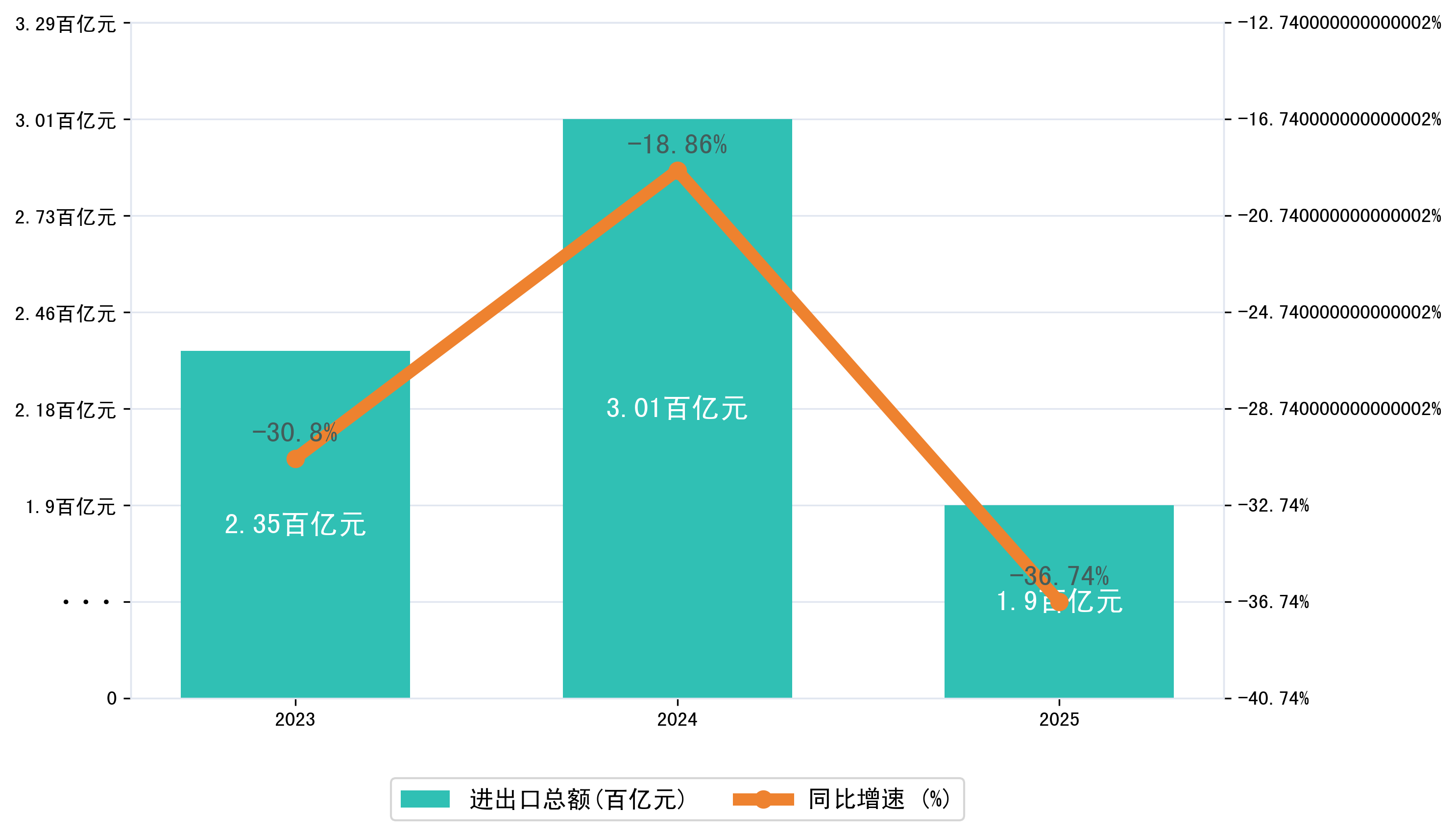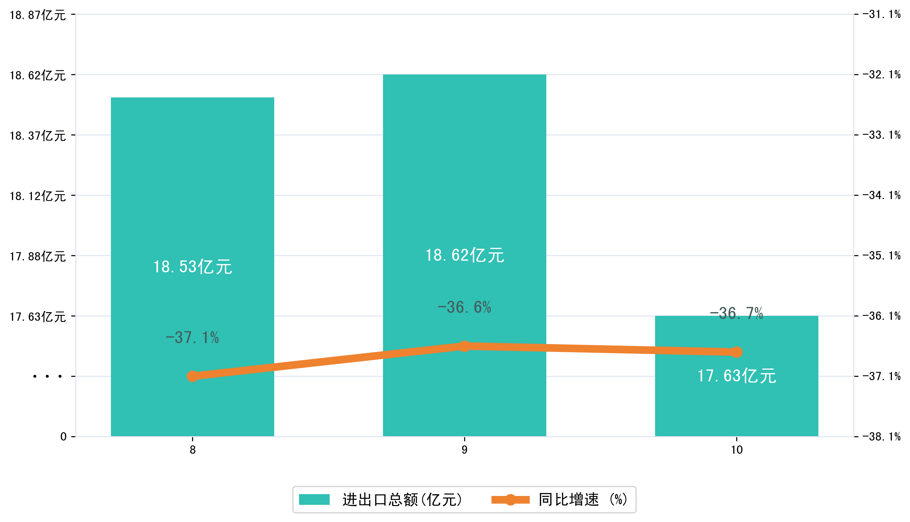 以人民币计,2025年1-10月湘潭市进出口总额为190,4283.2684万元,相比上年同期减少了110,6039.4257万元,同比减少了-36.70%。