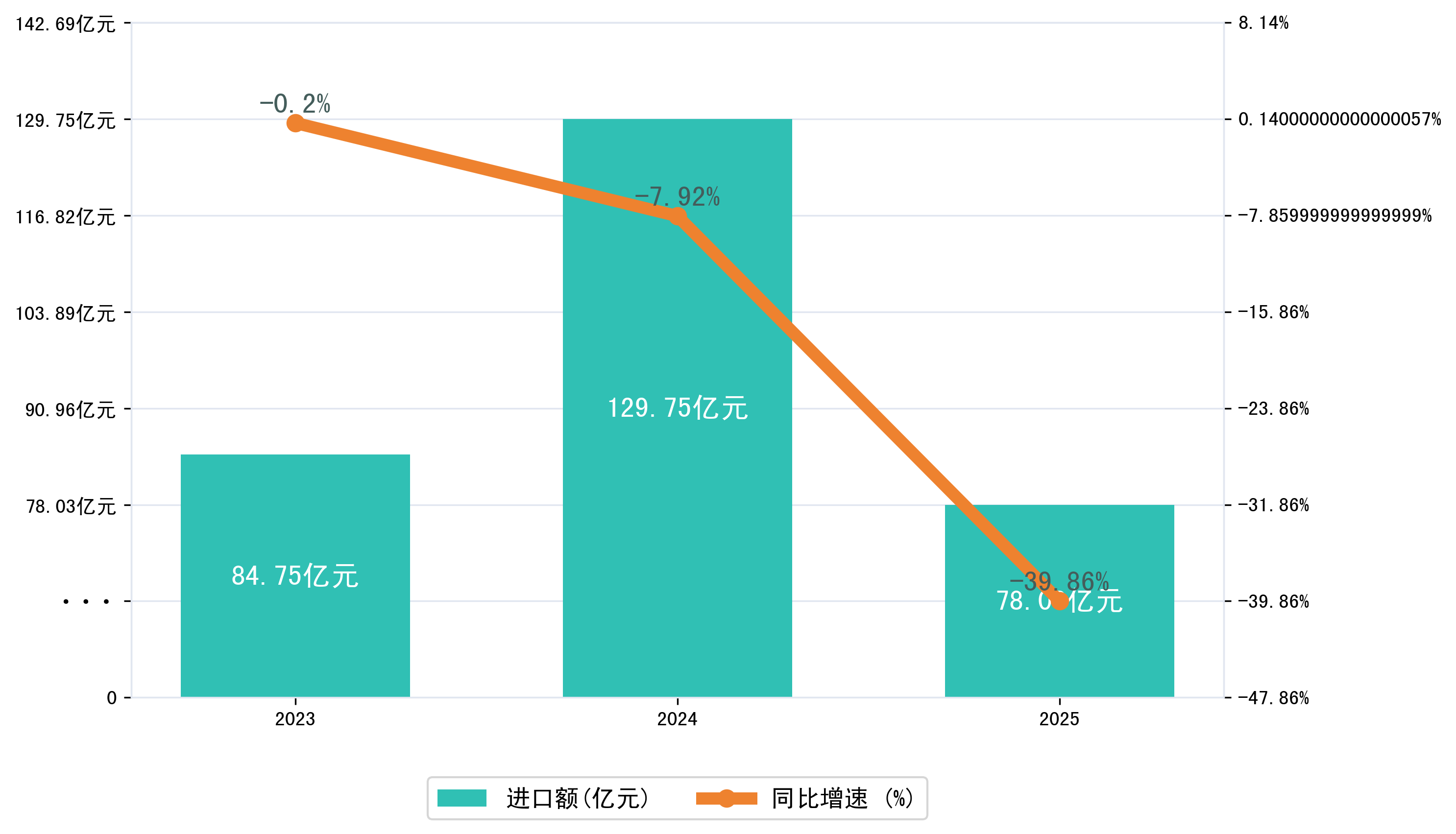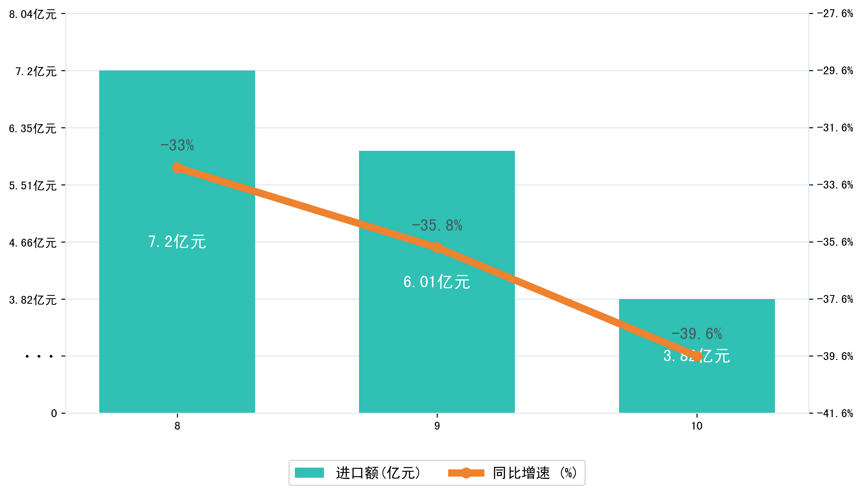 以人民币计,2025年1-10月湘潭市进口额为78,0333.8957万元,相比上年同期减少了51,7215.5676万元,同比减少了-39.60%。