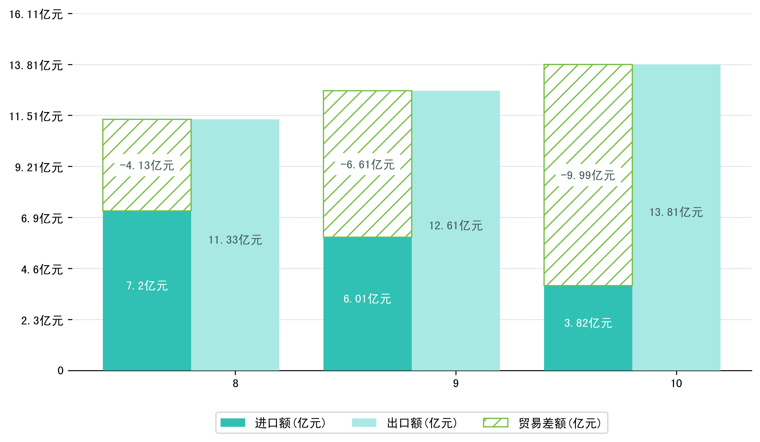 以人民币计,2025年10月湘潭市贸易差额为9,9887,1021万元(贸易顺差),相比上月增加了3,3829,2318万元,即4757,4414万美元;相比上年同期增加了9,0810,7117万元,同比增加1000.52%。