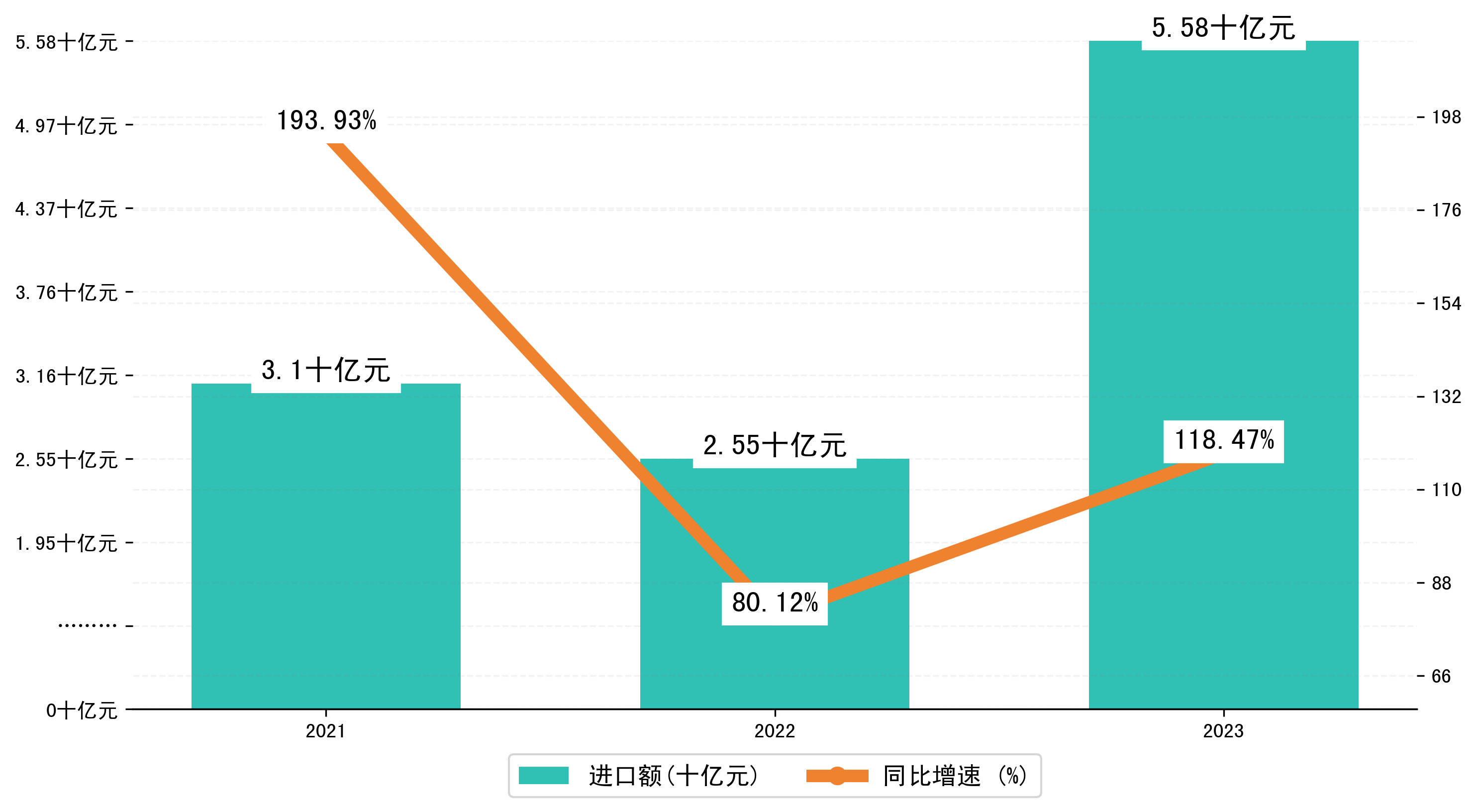 以人民币计,2023年1-12月襄阳市进口额为55,7520.8733万元,相比上年同期增加了30,2324.416万元,同比增加了118.50%。