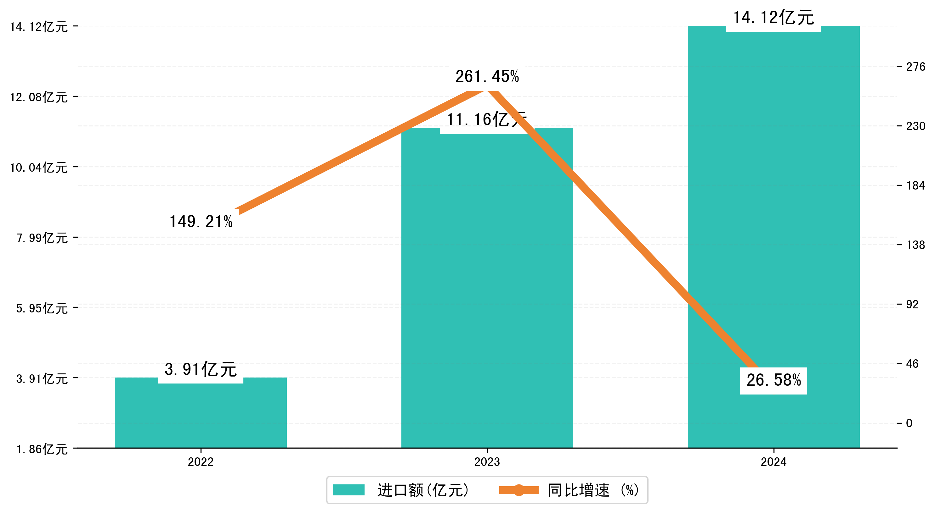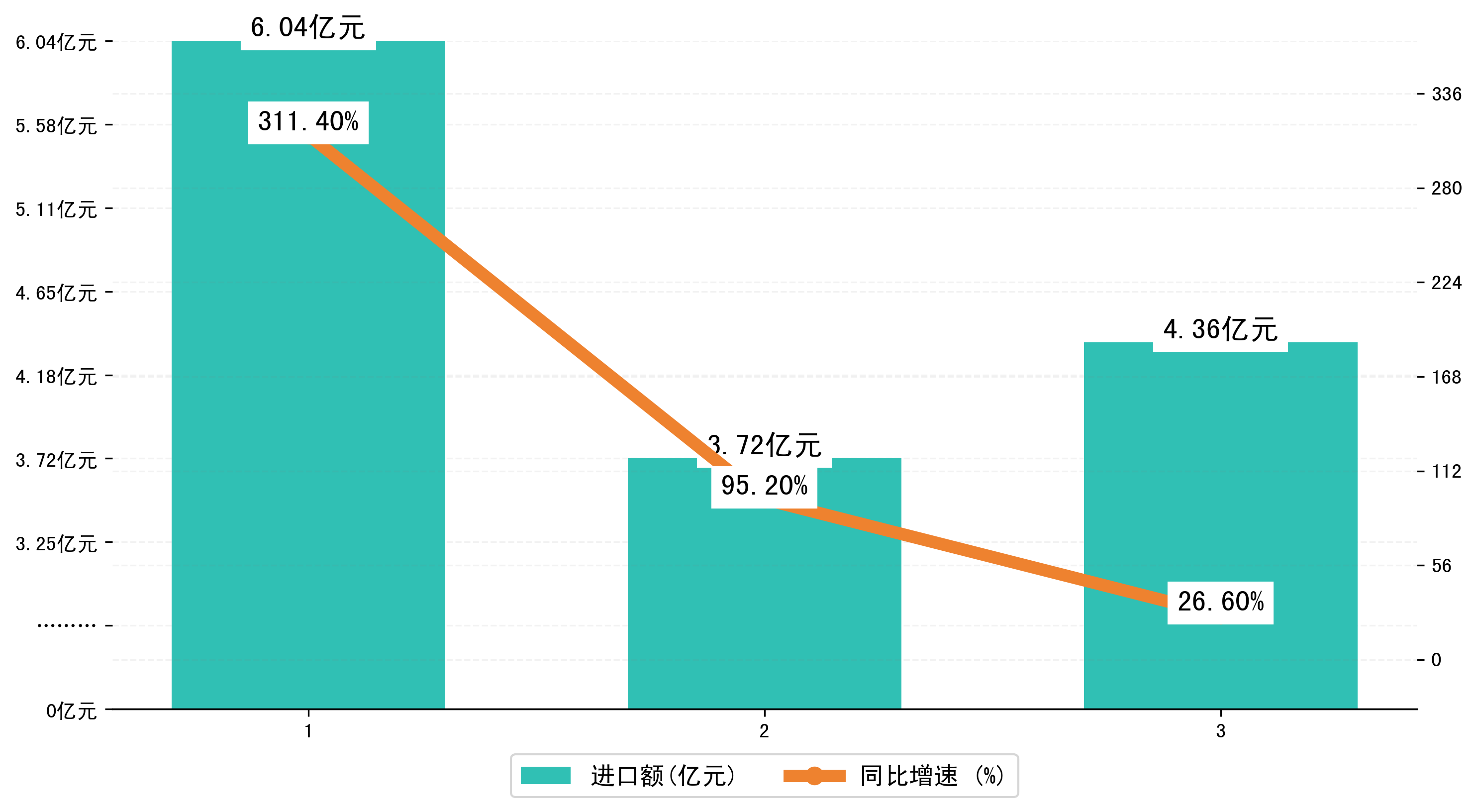 以美元计,2024年1-3月襄阳市进口额为1,9899.3352万美元,相比上年同期增加了3645.0885万美元,同比增加22.40%。