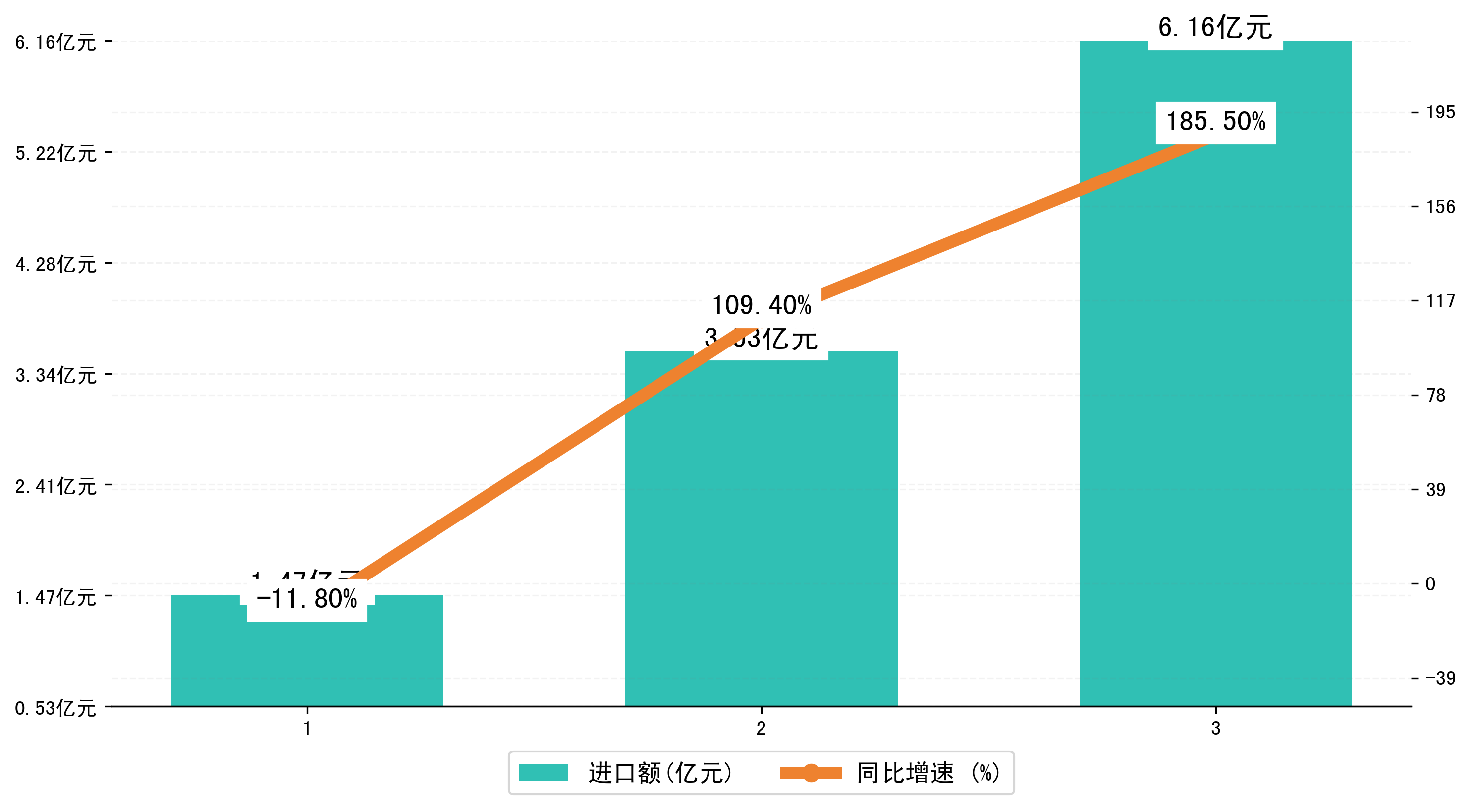 以人民币计,2023年3月襄阳市进口额为6,1554.9332万元,相比上月增加了2,6238.5116万元;相比上年同期增加了4,6362.6767万元,同比增加了185.50%。