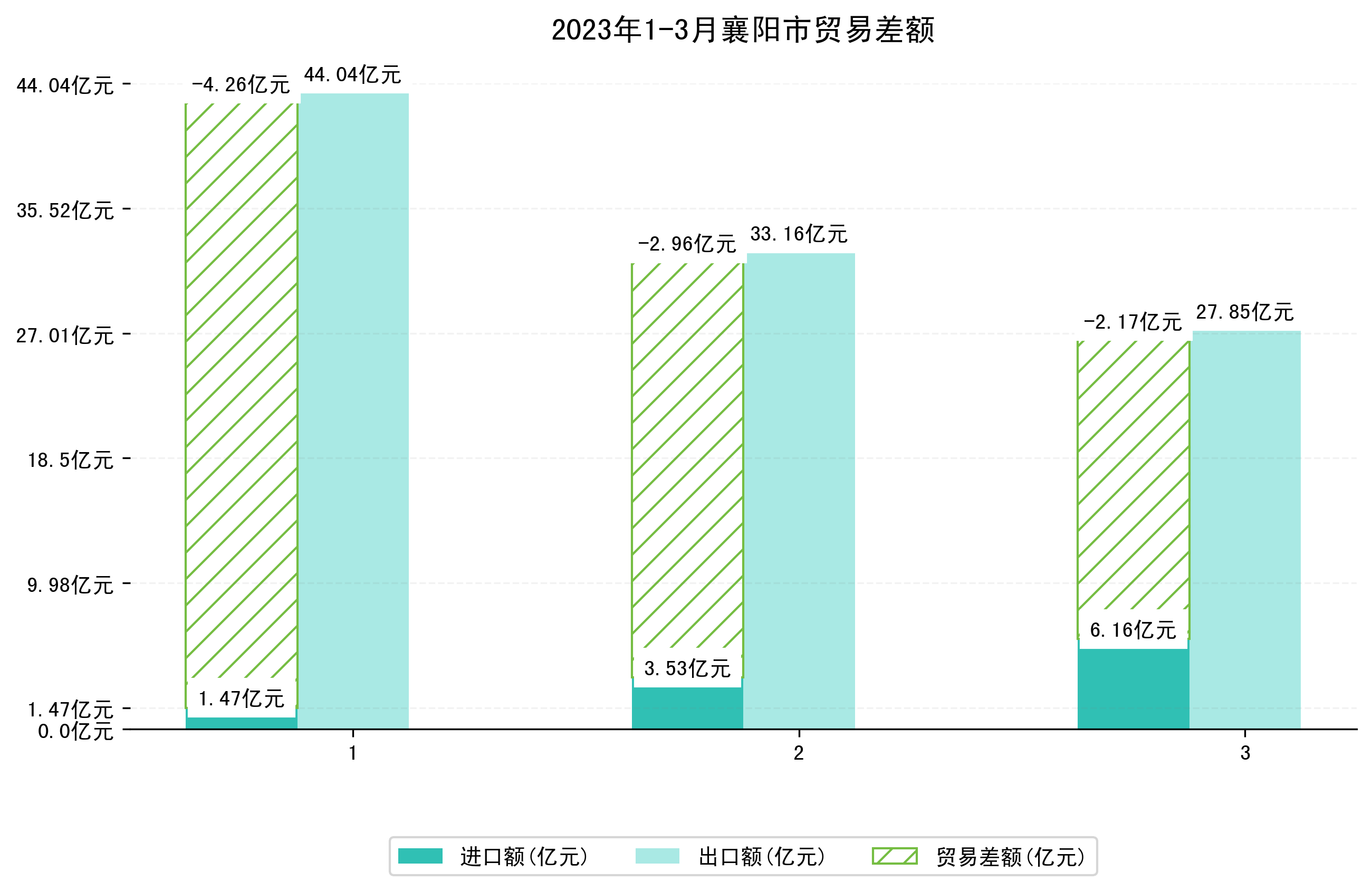 以美元计,2023年1-3月襄阳市贸易差额为13,6633,9211万美元(贸易顺差),相比上年同期增加了3,5526,6761万美元,同比增加35.14%。