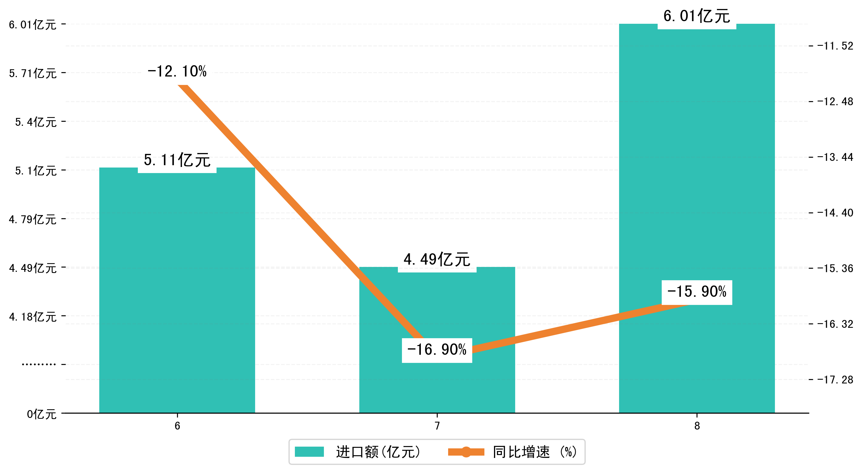 以美元计,2024年1-8月咸阳市进口额为5,6533.1478万美元,相比上年同期减少了1,2348.6364万美元,同比减少-17.50%。