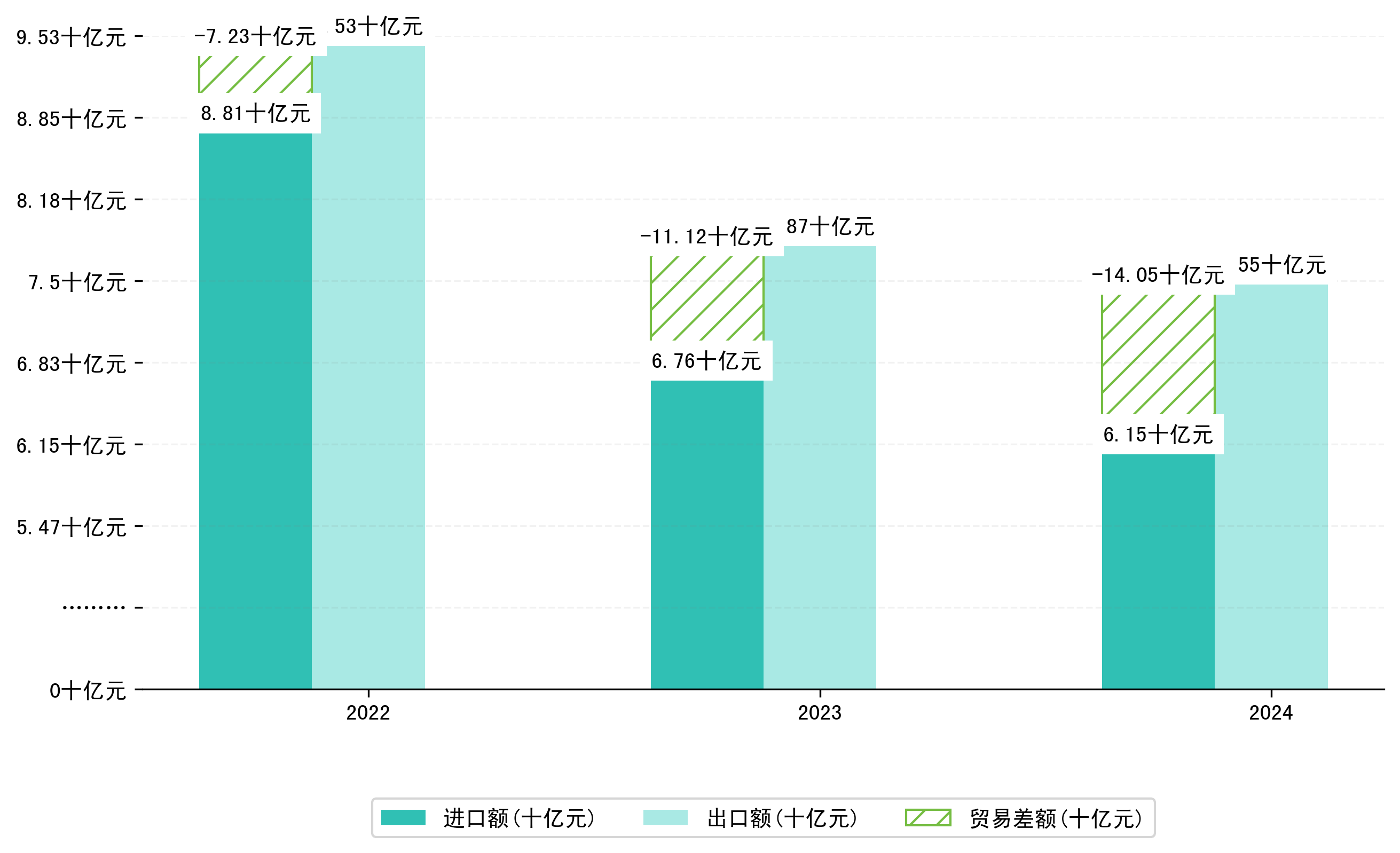 以人民币计,2024年1-12月咸阳市贸易差额为14,0494,1986万元(贸易顺差),相比上年同期增加了2,9258,0342万元,同比增加26.3%。