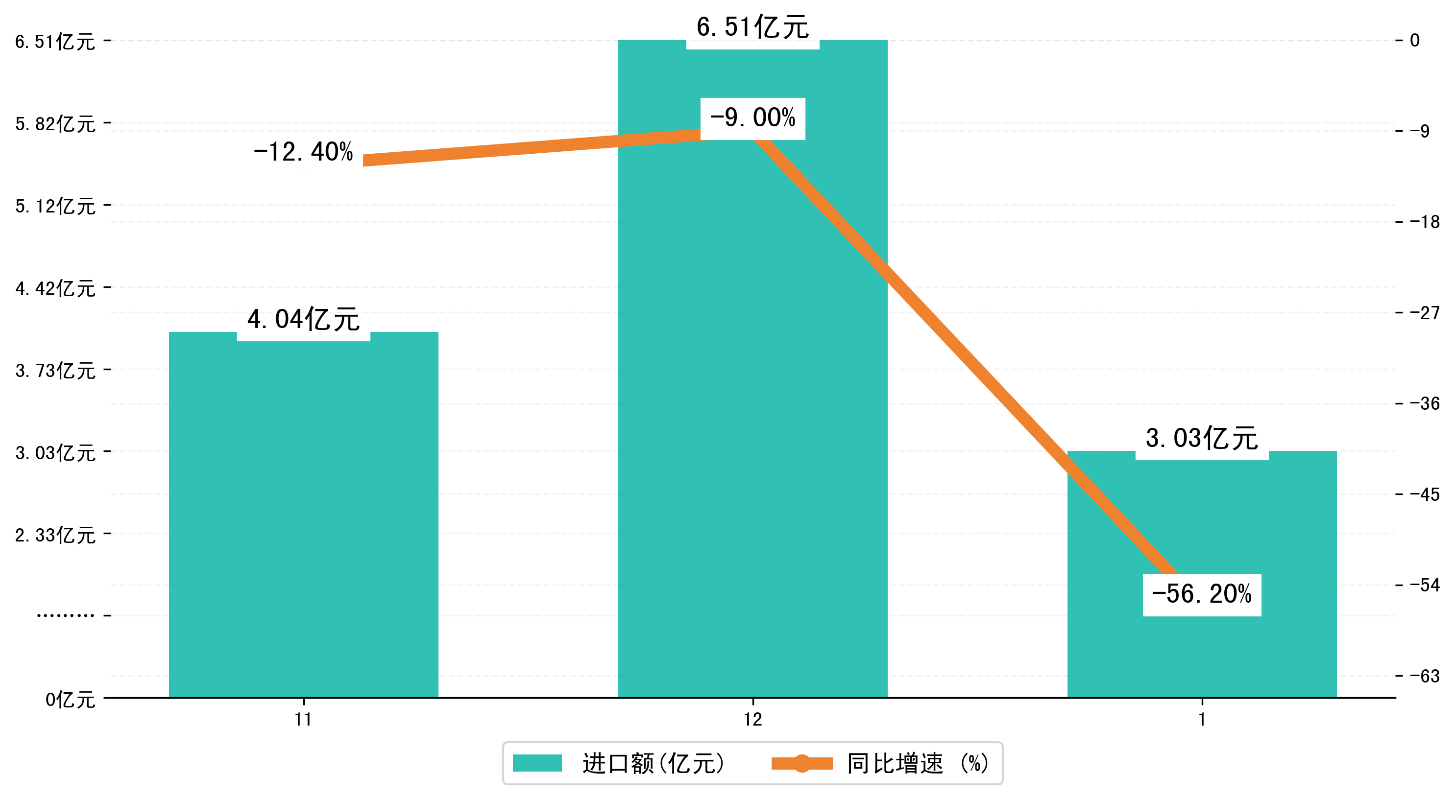 以美元计,2025年1月咸阳市进口额为4211.5888万美元,相比上月减少了4910.5862万美元;相比上年同期减少了5781.0713万美元,同比减少-56.80%。