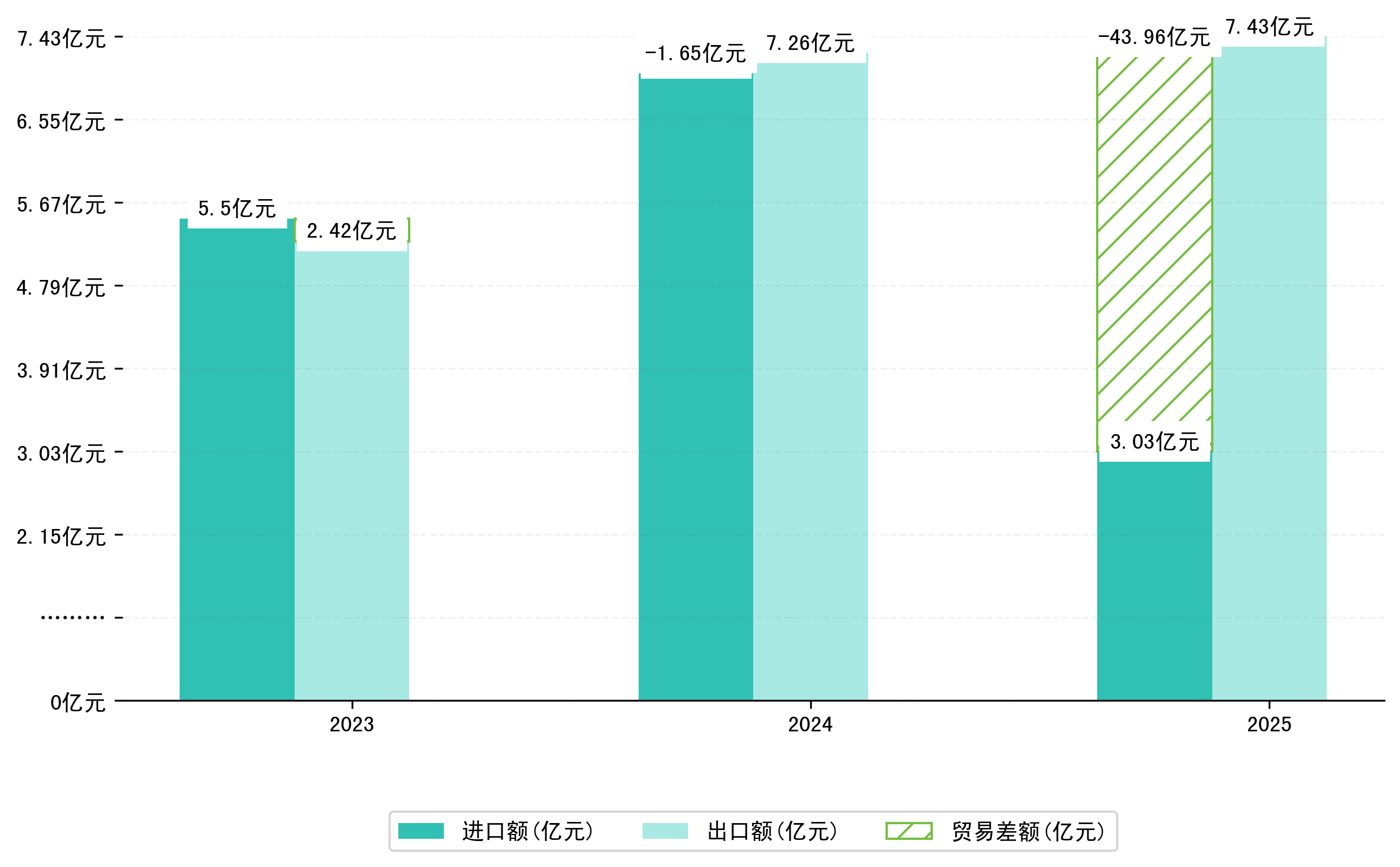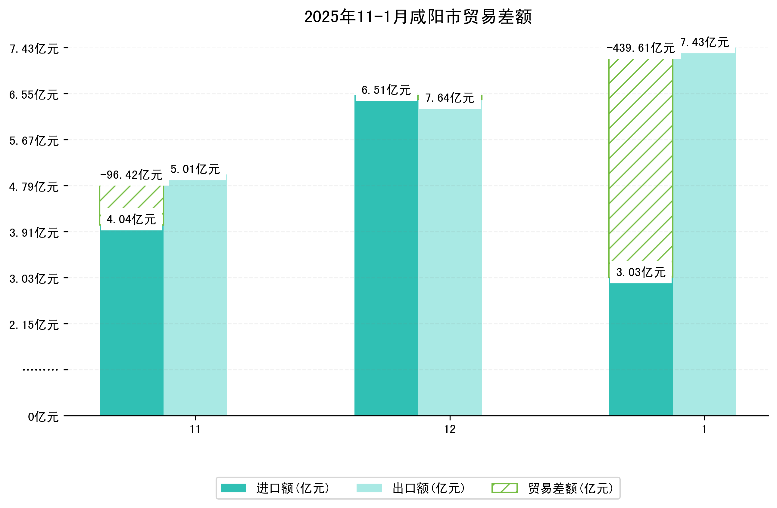 以人民币计,2025年1-1月咸阳市贸易差额为4,3960,5279万元(贸易顺差),相比上年同期增加了4,2314,1051万元,同比增加2570.06%。