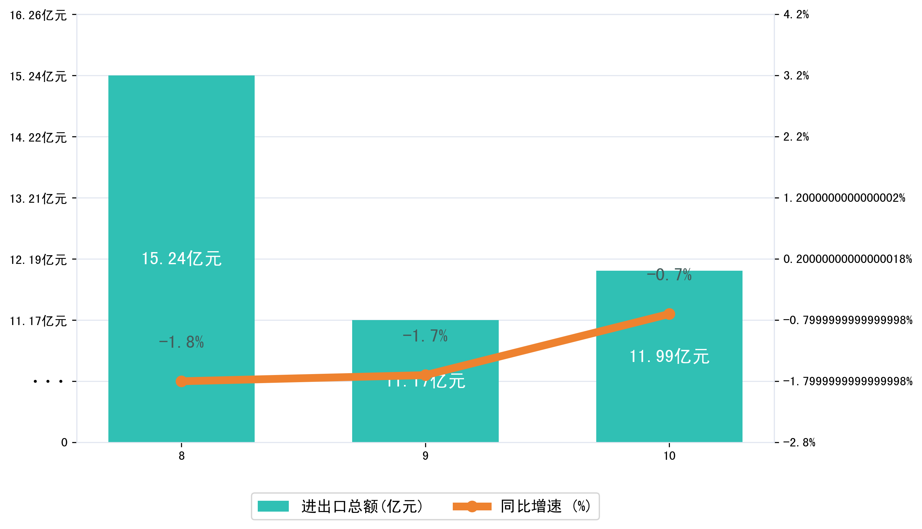 以人民币计,2025年10月咸阳市进出口总额为11,9936.7995万元,相比上月增加了8198.0606万元;相比上年同期增加了9684.0755万元,同比减少了-0.70%。
