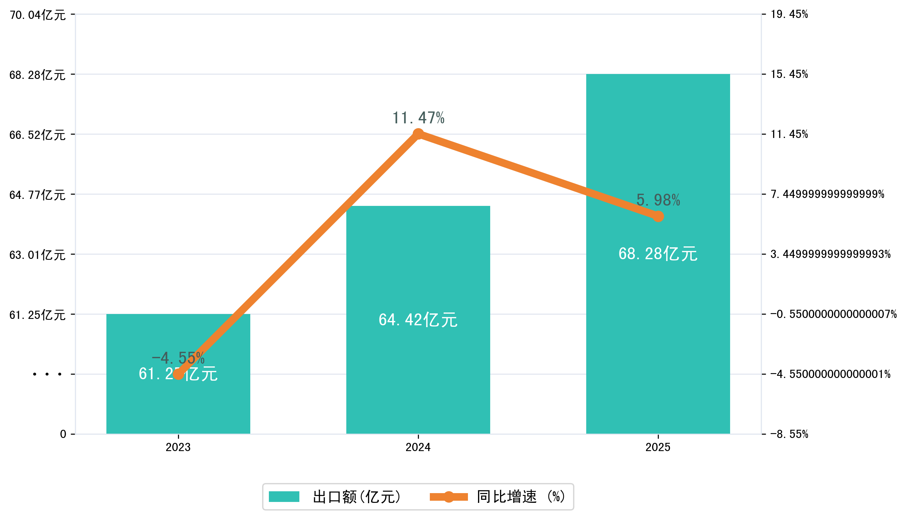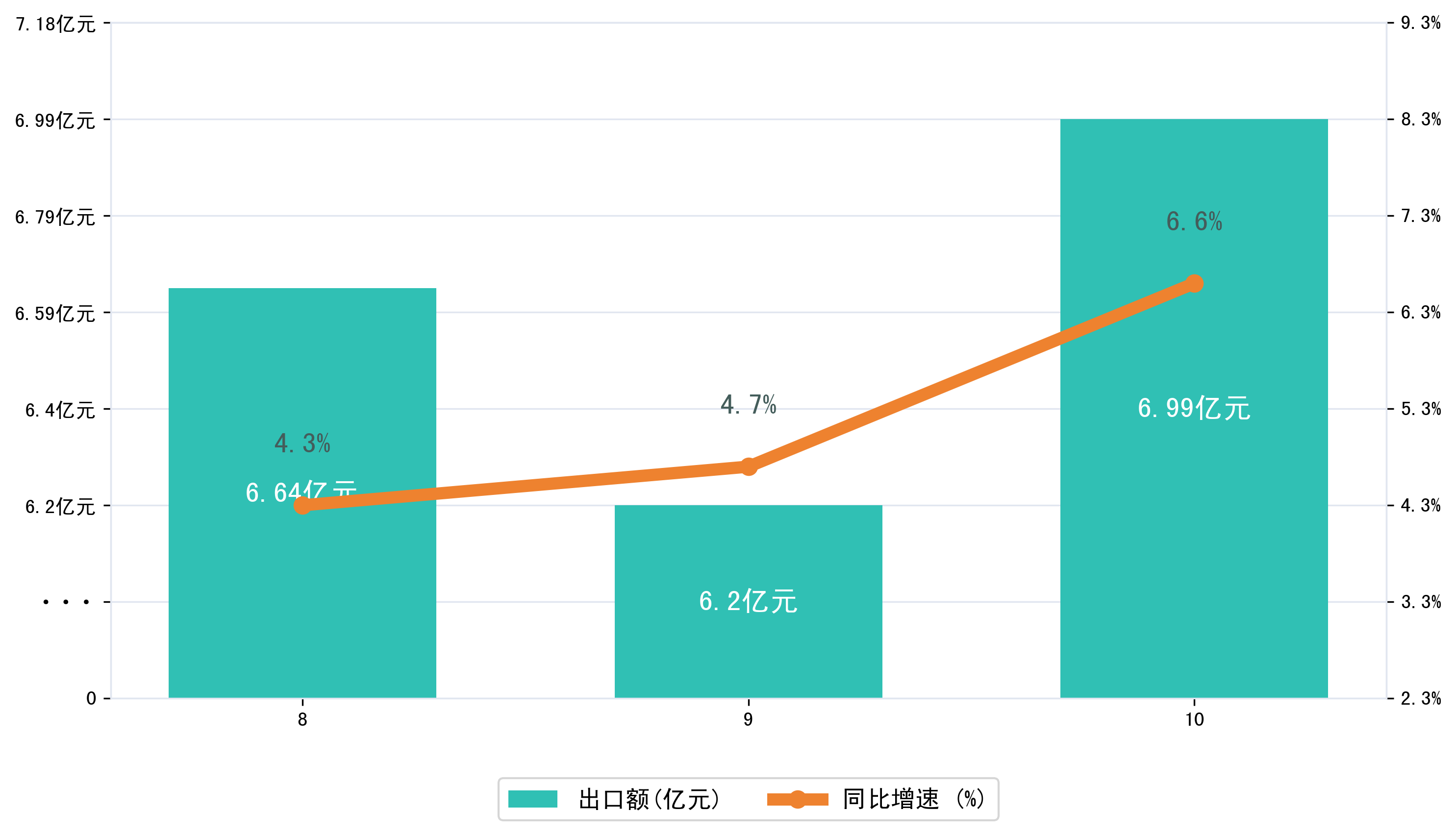 以人民币计,2025年10月咸阳市出口额为6,9853.9783万元,相比上月增加了7830.6055万元;相比上年同期增加了1,4930.2863万元,同比增加了6.60%。