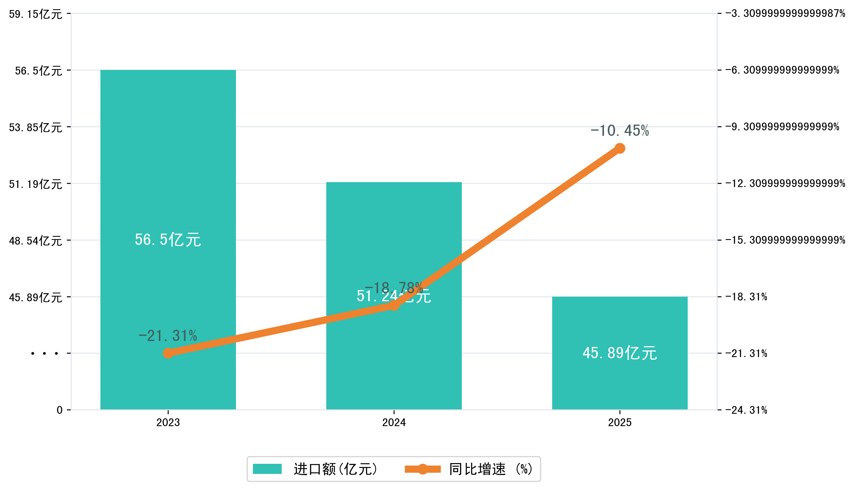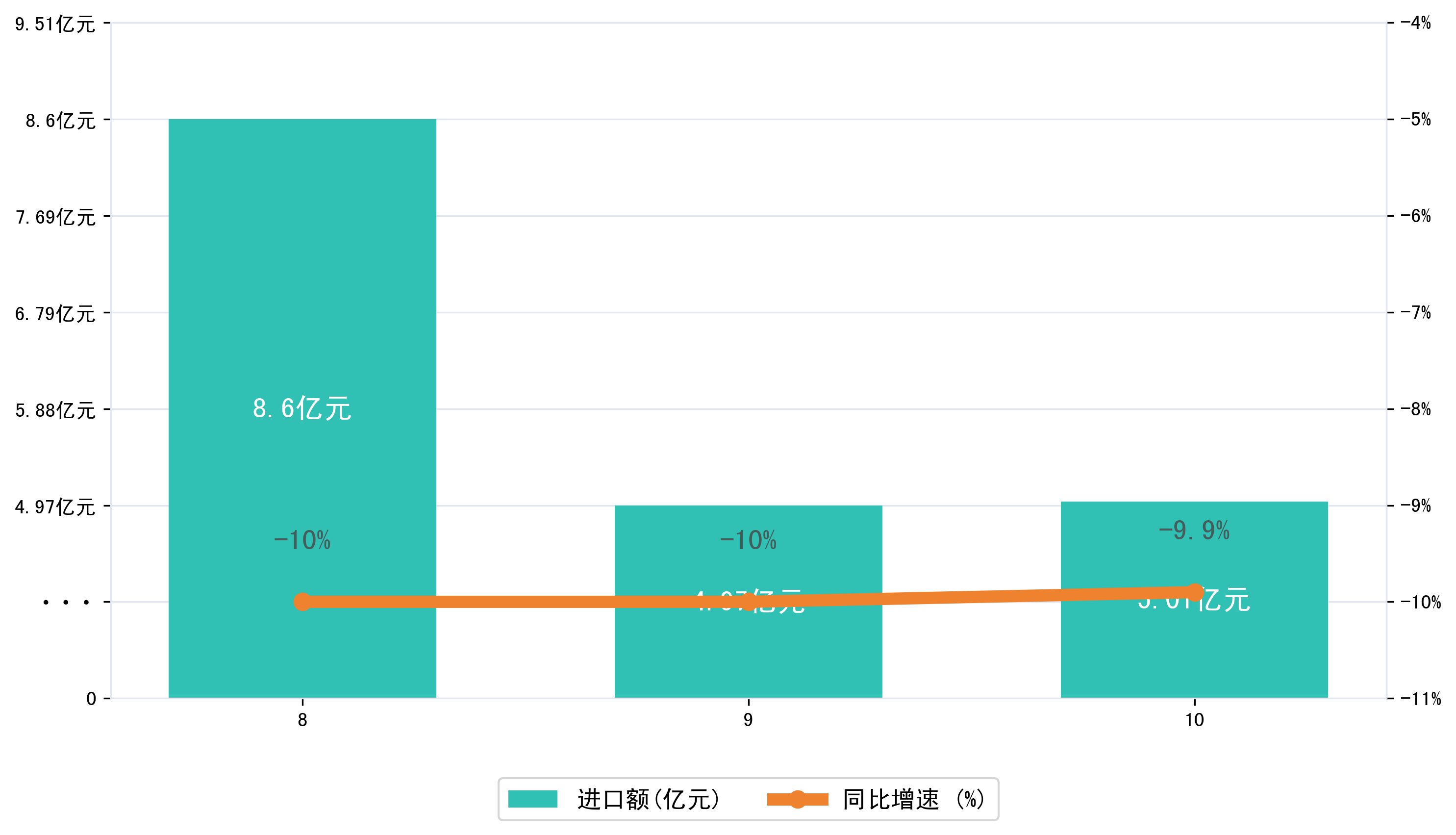 以人民币计,2025年1-10月咸阳市进口额为45,8869.6312万元,相比上年同期减少了5,3525.106万元,同比减少了-9.90%。