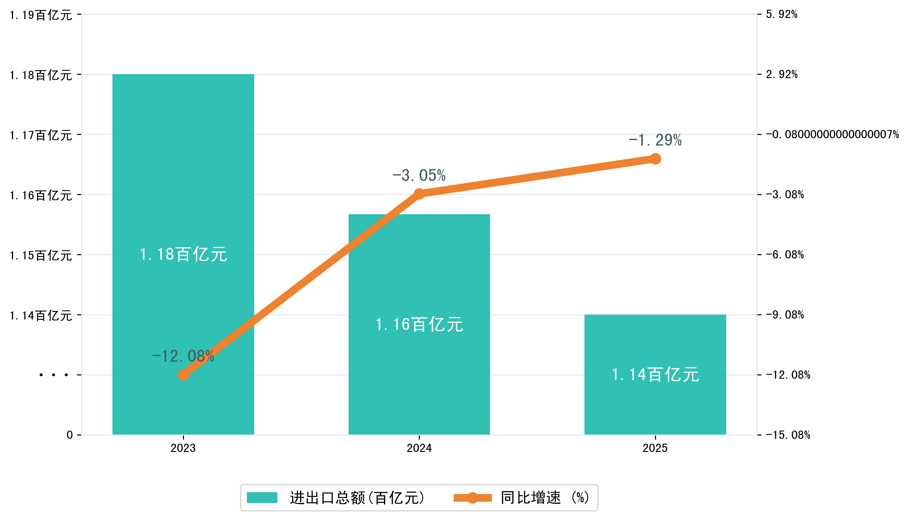 以人民币计,2025年1-10月咸阳市进出口总额为114,1662.2434万元,相比上年同期减少了1,4969.7424万元,同比减少了-0.70%。