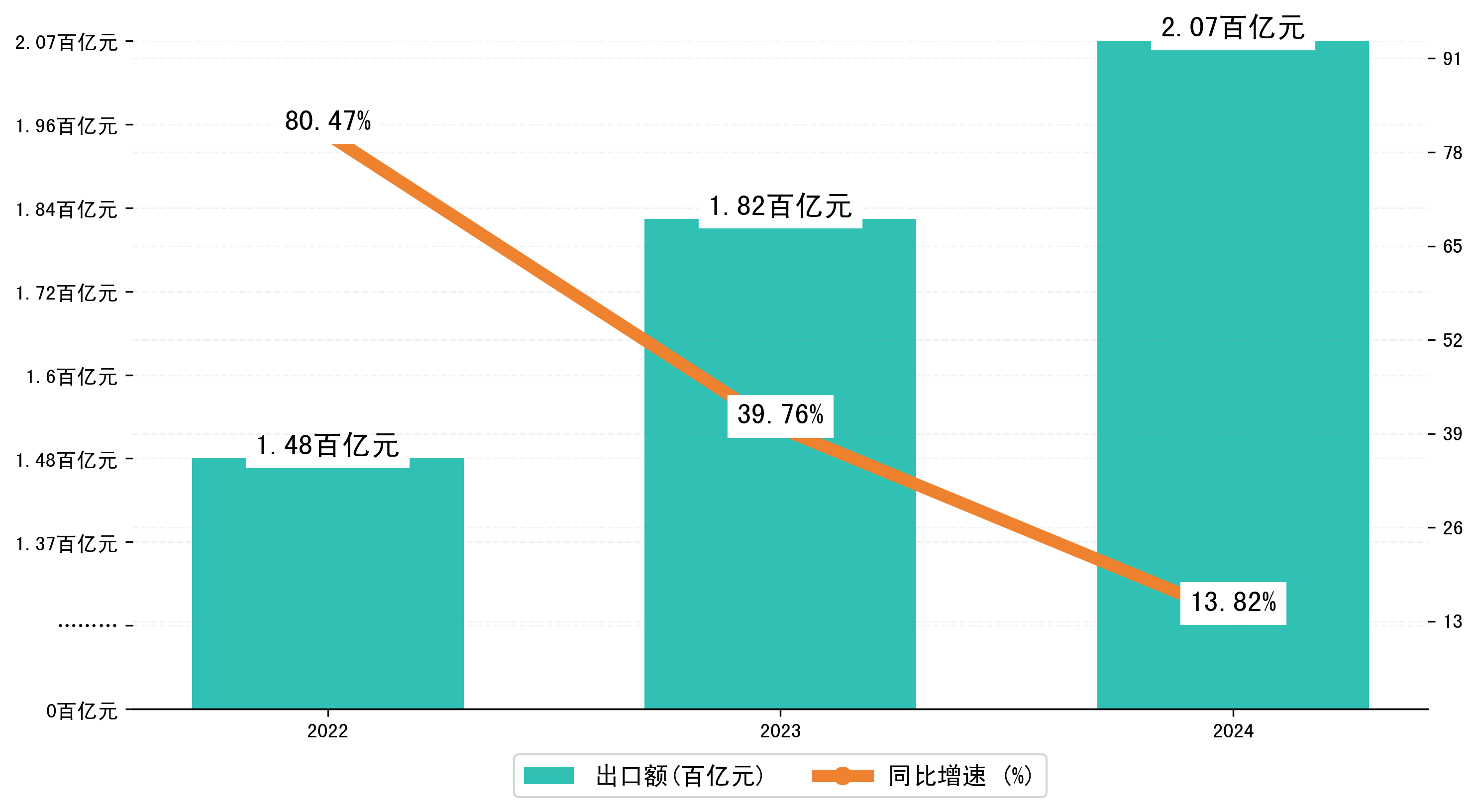以人民币计,2024年1-12月孝感市出口额为207,4872.6984万元,相比上年同期增加了25,1935.9464万元,同比增加了14.00%。