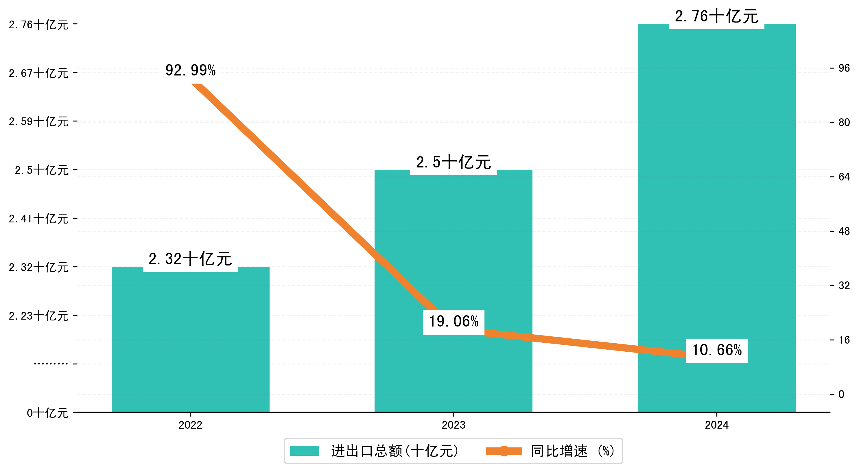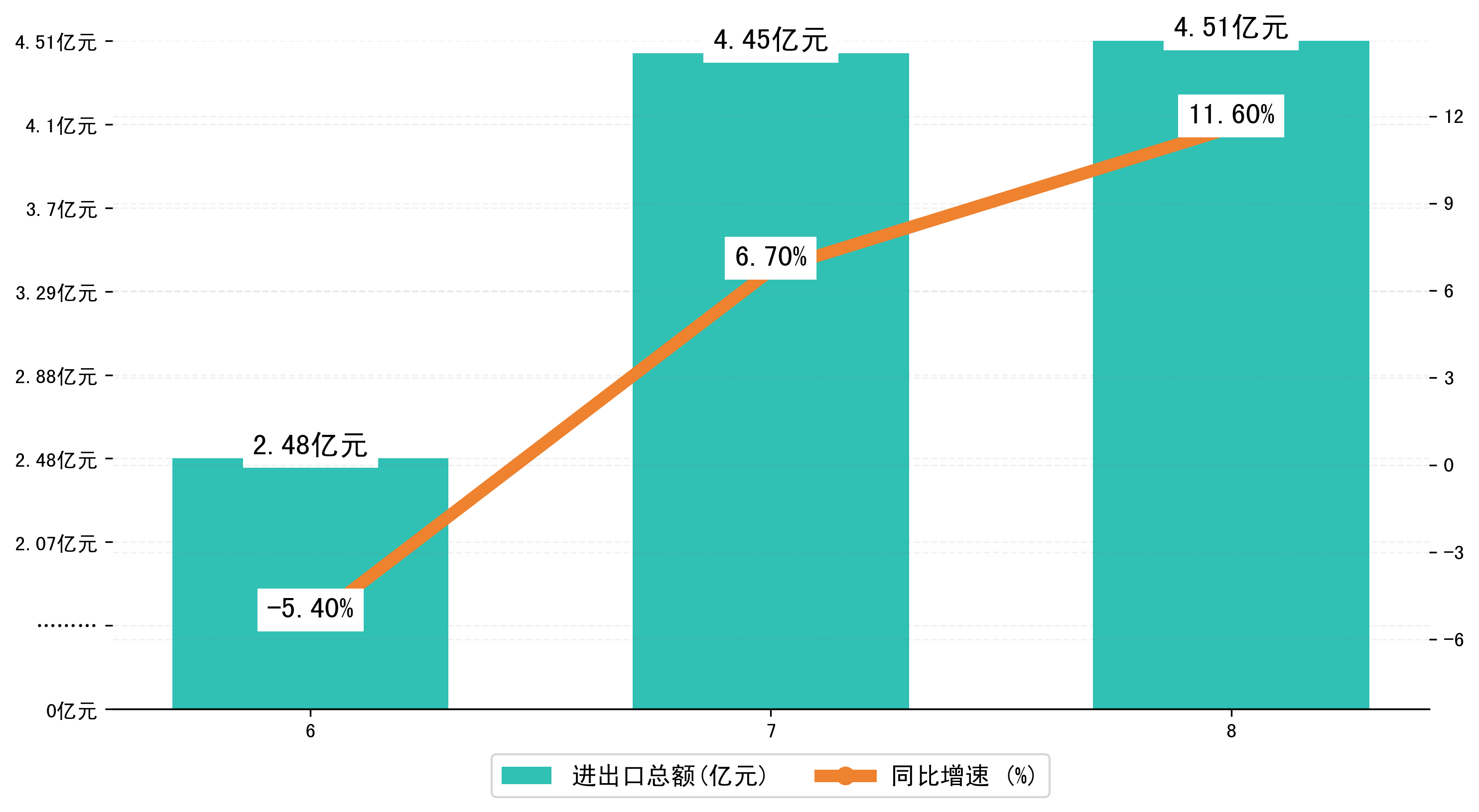 以人民币计,2024年1-8月西宁市进出口总额为27,6257.5284万元,相比上年同期增加了2,6611.9623万元,同比增加了11.60%。