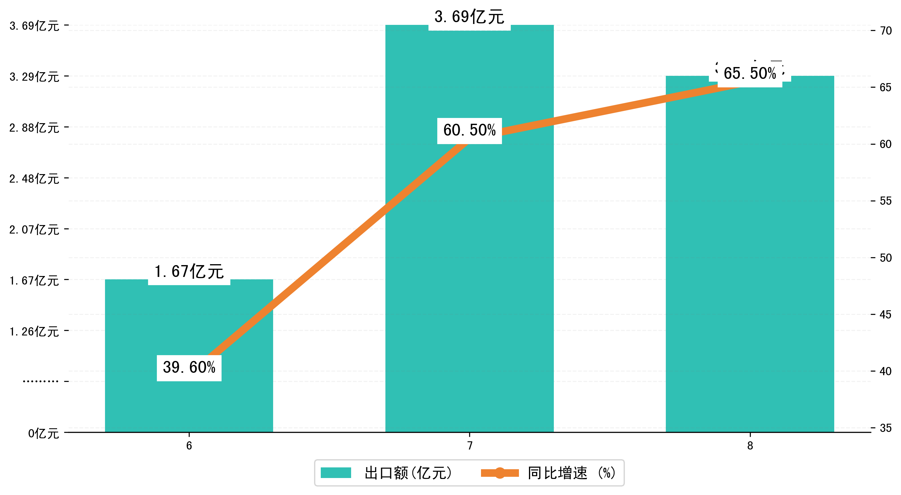以人民币计,2024年1-8月西宁市出口额为18,1068.7104万元,相比上年同期增加了6,8178.4689万元,同比增加了65.50%。